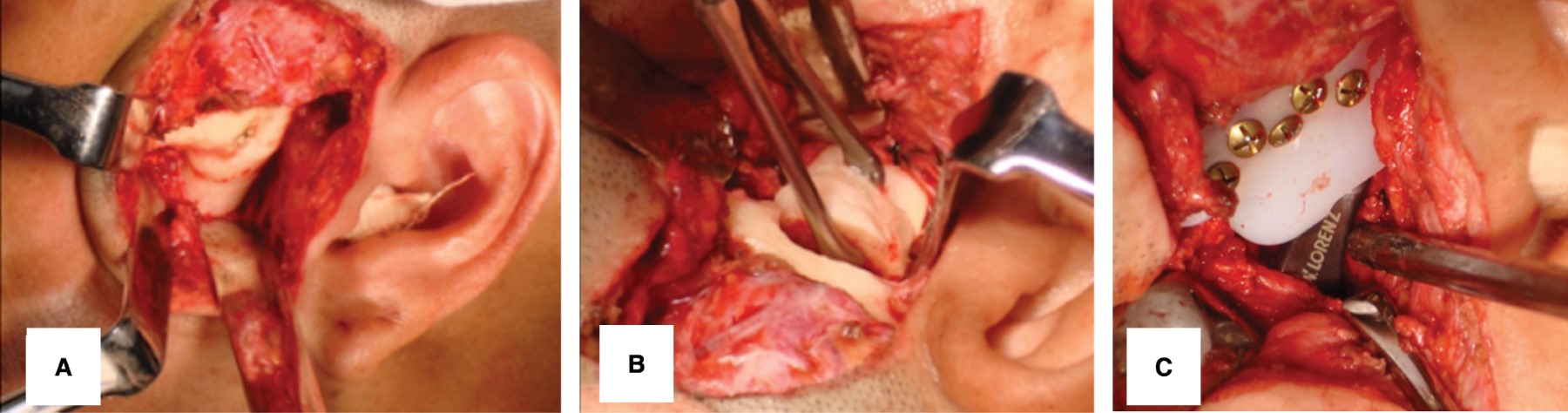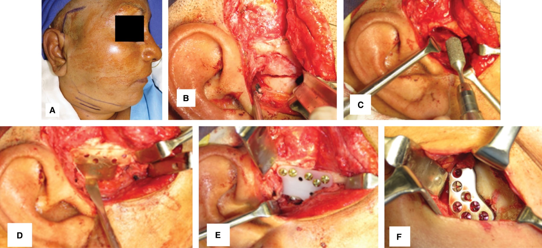 La técnica quirúrgica consistió en abordaje preauricular con extensión anterosuperior, en palo de hockey. Previa tricotomía de la zona superior al helix y anterior al trago de la oreja, se marca el abordaje, y se infiltra lidocaína con epinefrina de manera subcutánea (Figura 4A). Se realizó incisión hasta la capa superficial de la fascia temporal, de esta manera los vasos temporales superficiales y el nervio auriculotemporal se retraen junto con el colgajo anterior; se continuó la disección obtusa sobre el arco cigomático justo por delante del trago para proteger las ramas temporales del nervio facial. Posteriormente, cuando la disección estuvo a un centímetro por debajo del arco cigomático, se accedió hasta la cápsula articular.31 Se retiró todo el tejido anquilosado mediante ostectomía del cóndilo y coronoidectomía, verificando movimientos mandibulares (Figura 4B). Previa remodelación de la cavidad glenoidea, se corrobora el tamaño de acetábulo, para fijar el acetábulo definitivo32,33 (Figura 4 C-E).