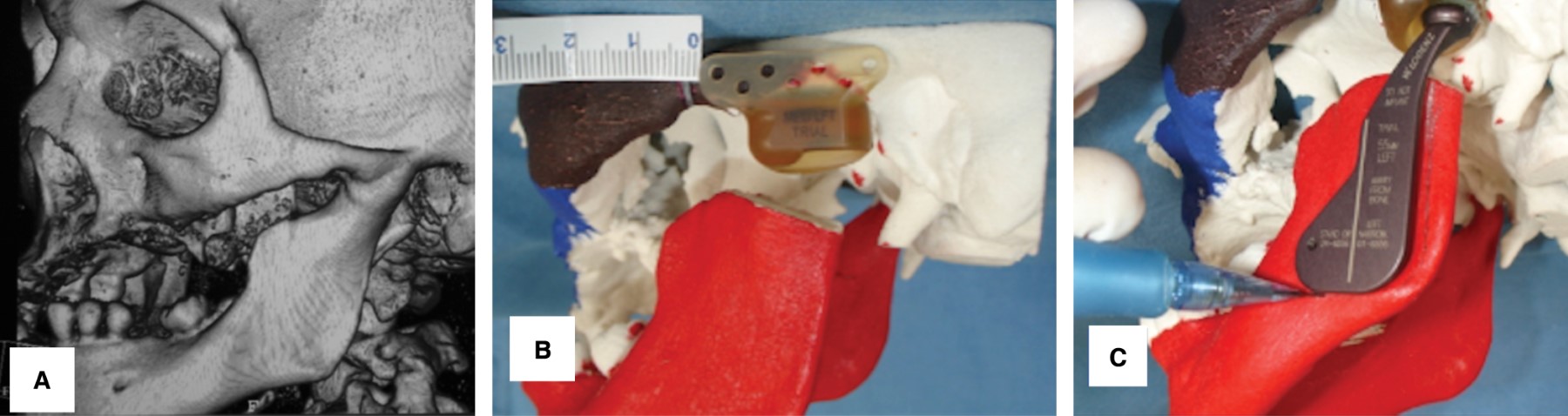 Se trató de una mujer de 41 años, la cual en 1999 inició su padecimiento de anquilosis temporomandibular izquierda secundario a herida por proyectil de arma de fuego con orificio de entrada a nivel de ATM izquierda. Posteriormente presentó dolor intenso de tipo punzante en la zona preauricular izquierda, imposibilidad de adecuada alimentación y una apertura limitada de 10 mm. En la tomografía se observa una anquilosis tipo IV según Sawhney de ATM izquierda, en donde se observa una fusión ósea ancha, que se extiende desde la rama y cavidad glenoidea, reemplazando por completo la arquitectura de la articulación (Figura 5A). Se realizó el mismo protocolo de estudio (Figura 5 B y C). Con mismo manejo quirúrgico mediante anestesia general balanceada, se realiza abordaje preauricular y submandibular descritos en el caso 1, posteriormente se realiza artroplastia de ATM, coronoidectomía, ajuste y colocación de acetábulo y prótesis condílea de stock (Biomet Microfixation), coincidiendo con la planeación previa en la estereolitografía (Figura 6 A-C).