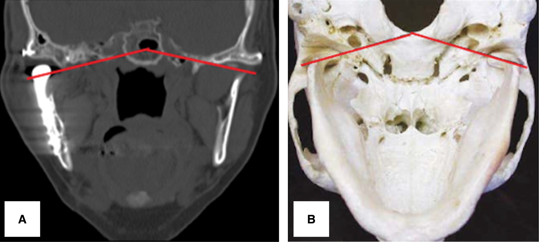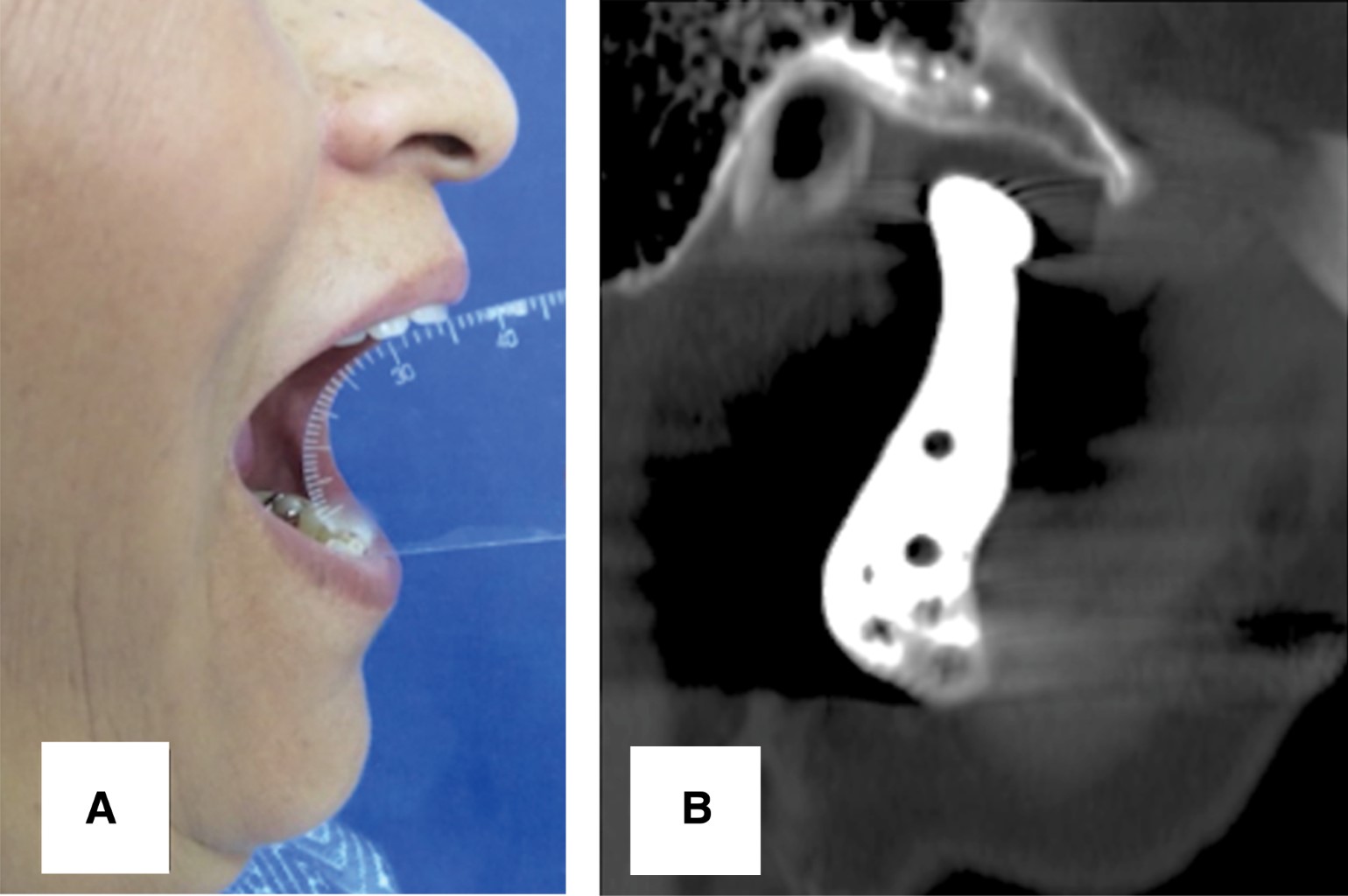 La paciente del caso 1 posterior a la cirugía presento 20 milímetros de apertura bucal, iniciando fisioterapia forzada al día siguiente del RTATM y durante seis meses más. Incluso ella refiere continuar con los mismos de manera ocasional por iniciativa propia. Actualmente con un seguimiento a cinco años no hay evidencia de reanquilosis, presentando una apertura de 35 mm (Figura 7 A y B), con movimientos mandibulares protrusivos y laterales y oclusión estable. La comparación de una corte coronal de una vista inferior del cráneo mostró simetría de las articulaciones temporomandibulares (Figura 8 A y B).