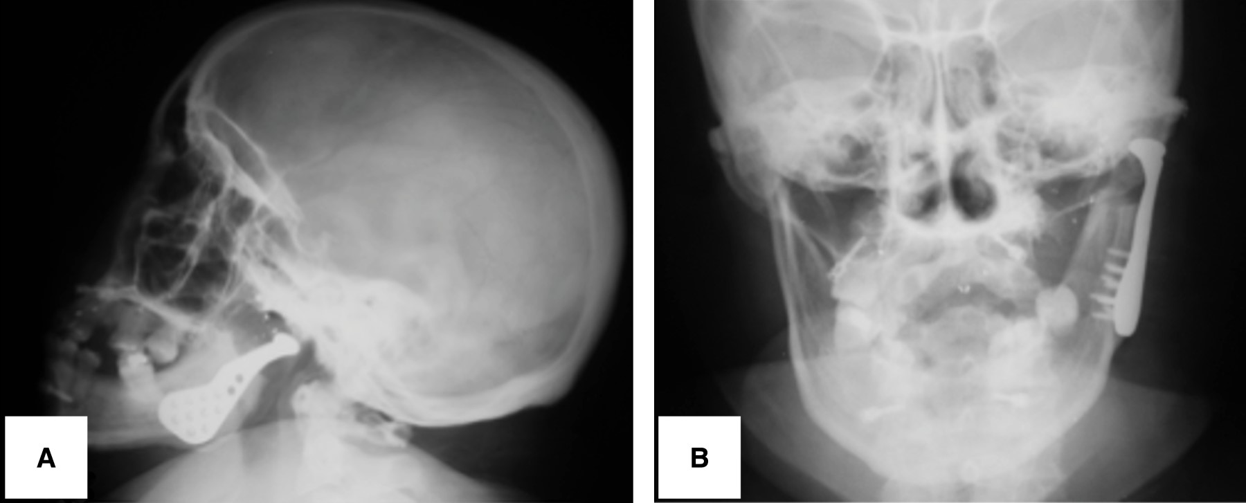 Respecto al caso 2, la prótesis se encuentra funcional, sin datos de reanquilosis (Figura 9 A y B). Al inicio del protocolo presentó una apertura bucal de tan sólo 10 mm, postquirúrgica de 15 mm y después de 20 años de 30 mm, movimientos mandibulares conservados. Cabe destacar que sólo en la zona preauricular continuó con parestesia, la cual ya presentaba antes de la cirugía como secuela de la herida por proyectil de arma de fuego. Ambas pacientes refieren satisfacción y seguridad a la masticación de alimentos y de manera asintomática hasta el momento.