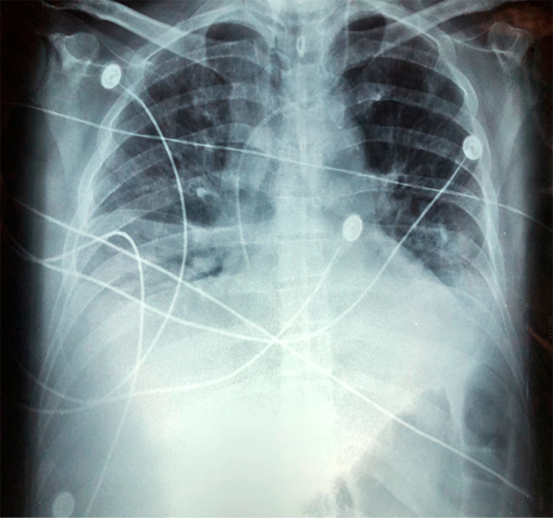 Posteriormente presenta datos de respuesta inflamatoria sistémica y elevación térmica asociándose en un inicio a sepsis abdominal y posteriormente a infección de catéter venoso central. Se realiza cambio del mismo sin mejoría reportando cultivo negativo, a lo cual se añaden estertores bésales y sibilancias. Al sexto día se integra clínicamente el diagnóstico de neumonía, mismo que es confirmado por radiografía de tórax (Figura 1), se solicita cultivo de secreción bronquial y se realiza tomografía toracoabdominal (Figura 2), que revela datos de neumonía asociada al ventilador y se agrega caspofungina al esquema antimicrobiano previo.