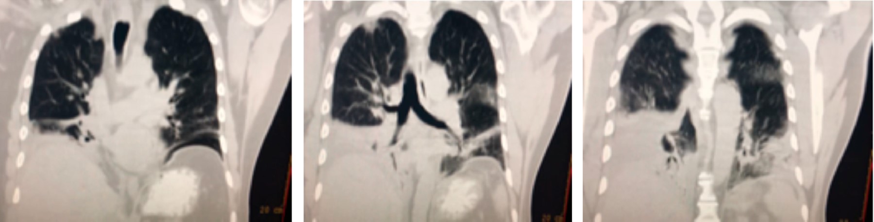 Seis días posteriores se reporta cultivo de secreción positivo para Trichosporon asahii, cambiando caspofungina por voriconazol, logrando su egreso de la UCI. Un día posterior el paciente presenta mejoría clínica, manteniendo una evolución favorable el resto de su estancia hospitalaria en tratamiento con voriconazol. Se realiza nueva tomografía de control, la cual muestra mejoría significativa de las zonas de consolidación en los lóbulos pulmonares inferiores así como del derrame pleural, el cual mostraba resolución casi total del hemitórax izquierdo y disminución del volumen del derrame pleural derecho. Por lo anterior, se decide su egreso a domicilio posterior a 22 días de estancia intrahospitalaria. Actualmente continúa con seguimiento por consulta externa con evolución favorable.