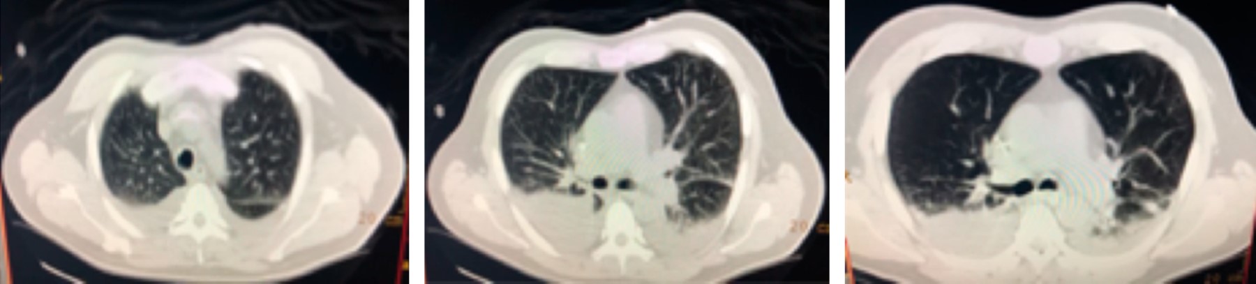 El paciente presenta mejoría relativa, se decide su extubación, un día posterior a esto persiste con deterioro clínico, se amplia cobertura de antimicrobianos para Staphylococcus aureus meticilino-resistente, se solicita nueva tomografía de tórax para control, en la cual persisten las zonas de consolidación en lóbulos inferiores, agregándose derrame pleural bilateral, el resto del estudio sin cambios significativos respecto al previo (Figura 3).