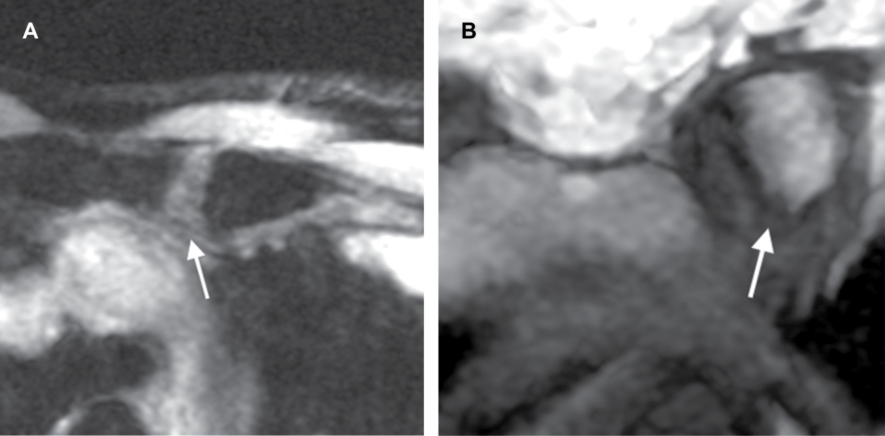 Los hallazgos característicos por resonancia magnética son engrosamiento del cartílago con aumento en la intensidad de señal de manera focal o generalizada en secuencias T2, STIR o T2 Fat Sat, edema subcondral y reforzamiento tras la administración de medio de contraste (Figura 2).