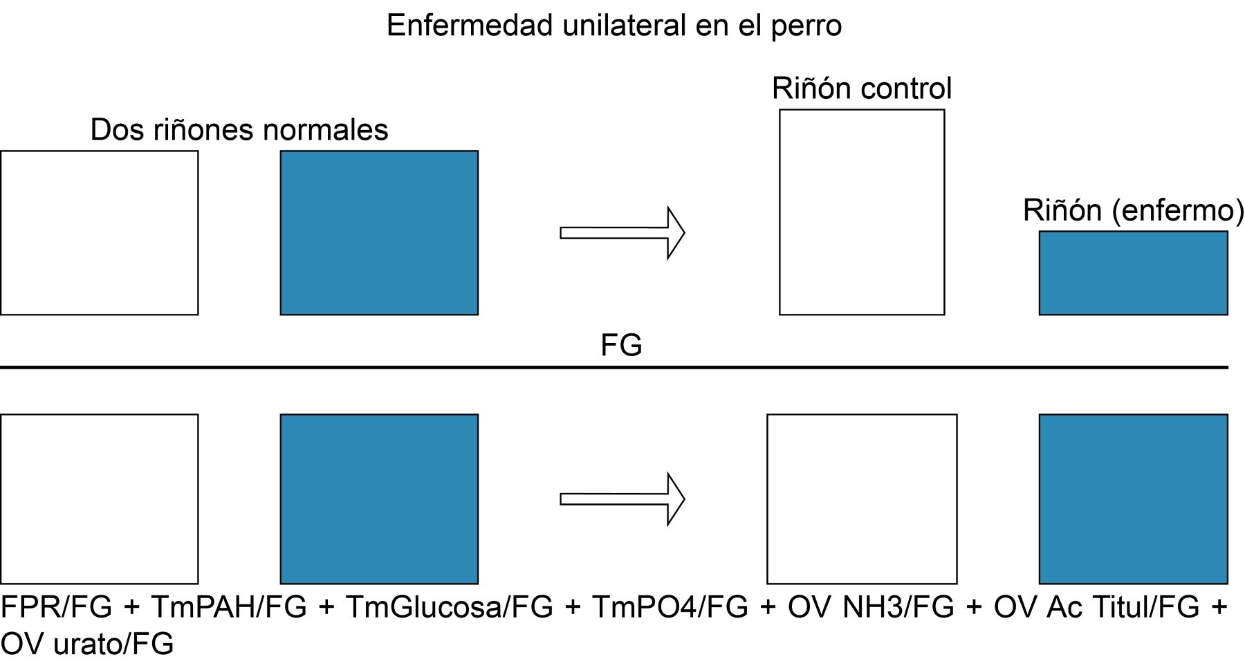 Los resultados de la medición del riñón enfermo en el perro en comparación con el riñón sano se muestran en la Figura 1. Se estudiaron ambos riñones, el control y el experimental, antes y después de la lesión. La filtración glomerular (FG) se estudió con depuración de inulina. En la parte superior de la gráfica se observa la función renal de los dos riñones normales, uno el que se va a lesionar, en oscuro. En la parte derecha, se observa el descenso de la FG en el riñón enfermo, en oscuro, al compararlo con el riñón sano, en claro. En la parte de abajo se muestra este mismo diseño, pero se grafican diversas funciones tubulares corregidas por la FG. La primera, la fracción filtrada, al dividir flujo plasmático renal efectivo entre la FG (FPR/FG), que se mantiene igual tanto en el riñón sano como en el enfermo. Además, se presentan otras funciones tubulares como transporte máximo de paramino hipurato de sodio (Tm PAH), Tm de glucosa y fosfato así como la excreción urinaria (OV) de urato, amonio y acidez titulable que, al corregirse por la FG, son iguales tanto en el riñón sano como en el enfermo (Figura 1). Estos resultados apoyaban la homogeneidad de las funciones tubulares y excretoras de las nefronas remanentes y la gran capacidad adaptativa del riñón a la progresión del daño renal; asimismo indicaban claramente que las nefronas que determinaban la función estaban intactas, y que las nefronas parcial o totalmente destruidas no contribuían a la función renal total; y si lo hacían, sería en un porcentaje tan bajo que no modificaban los resultados. Los datos de micropunción en modelos de 5/6 de nefrectomía o de daño renal en ratas y perros contribuyeron aún más a reafirmar la hipótesis de la nefrona intacta.8