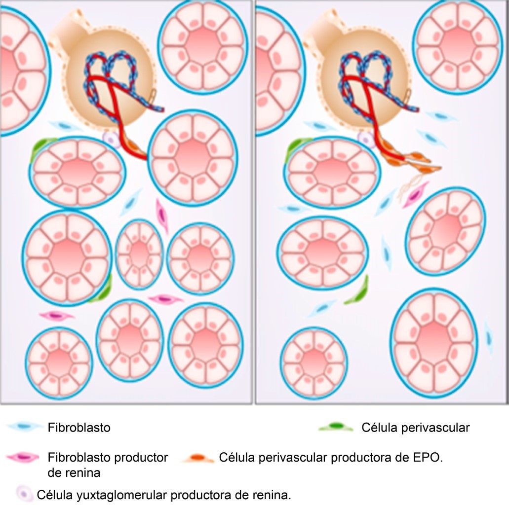 - 5. Esta destrucción progresiva del riñón propicia la aparición de anemia al destruirse los fibroblastos del túbulo intersticio que sintetizan eritropoyetina. Por otro lado, ocurre un incremento de la renina a expensas de los fibroblastos perivasculares en el túbulo intersticio que estimulan el sistema renina-angiotensina-aldosterona, que propicia la hipertensión arterial, complicación habitual en la enfermedad renal crónica. Es decir, el comportamiento de los fibroblastos del túbulo intersticio es diferente entre los que producen eritropoyetina, que se reducen notoriamente, y los fibroblastos perivasculares, que se incrementan y aumentan la síntesis de renina.