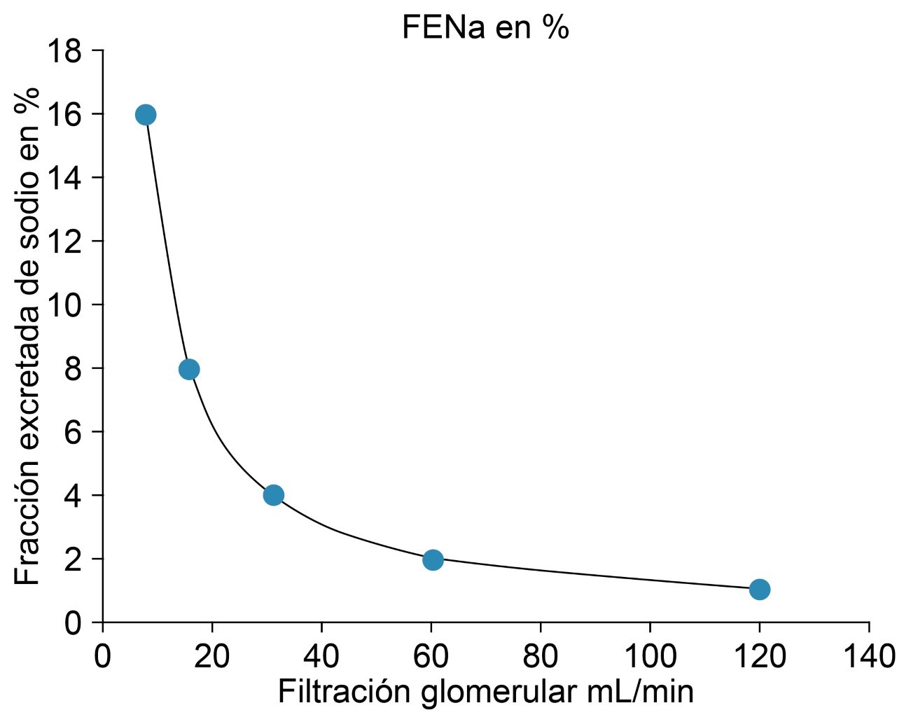 Como se observa en la Figura 2 y Tabla 1, la excreción de sodio aumenta en proporción a la reducción de nefronas y a la caída de la FG. La explicación a este fenómeno es que a medida que se reduce la función renal, en esa misma proporción el enfermo renal retiene sal, el volumen extracelular se expande y la fracción excretada de sodio aumenta. Tal como ocurre en el sujeto normal al expandir su volumen corporal, particularmente el espacio extracelular, con soluciones salinas o retarlo con dietas altas en sodio o con DOCA.11,12 Es una oferta de trueque (trade off), que es el mecanismo mediante el cual el organismo enfermo mantiene el balance de sodio a expensas de una retención progresiva de sodio y agua. Esta expansión del espacio extracelular se acompaña de la inhibición del sistema renina-angiotensina-aldosterona y de aumento del factor natriurético auricular, mecanismos ambos que mantienen en balance la excreción de sal. Más adelante discutiremos más ampliamente esta hipótesis del trueque o trade off, cuando analicemos la fisiopatología del hiperparatiroidismo secundario en la insuficiencia renal.