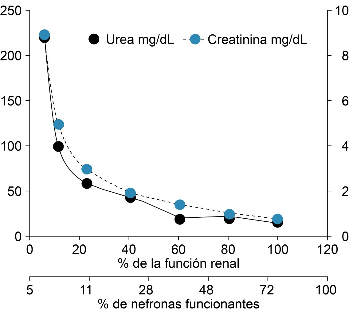 Otro ejemplo de esta adaptación es cómo se incrementan solutos como la urea y la creatinina a medida que se pierde la función renal.13 Como se ejemplifica en la Figura 3, se trata de un incremento exponencial de ambas variables urea y creatinina. Lo interesante de estas curvas es que son tan parecidas que las grafiqué juntas. Ambos metabolitos se mantienen en valores normales o muy cercanos a ellos hasta que la pérdida de la función renal va más allá de 80%. A este descenso en la función se suman otras alteraciones bioquímicas, minerales, endocrinas, hematológicas, nutricionales y tóxicas. Éstas son progresivas y todas sumadas constituyen clínicamente lo que conocemos como síndrome urémico.