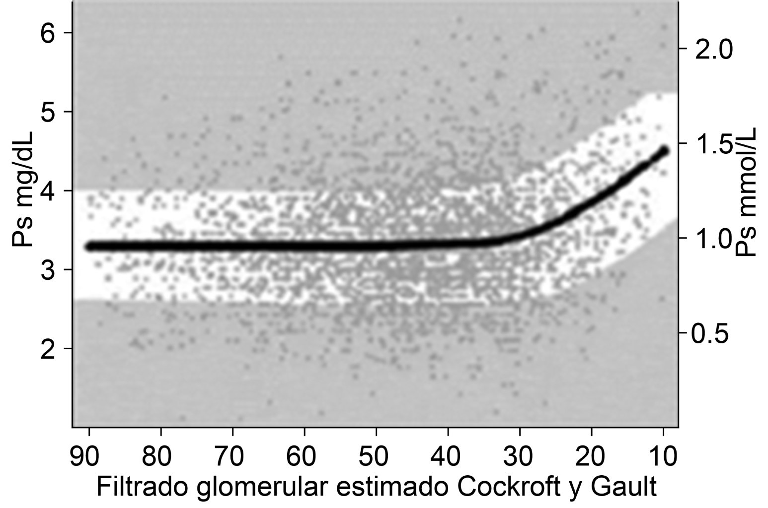 La alteración fundamental que ocurre especialmente en el metabolismo del fósforo, es que se retiene desde etapas tempranas del daño renal. Sin embargo, sus valores se mantienen en cifras normales de 3.5 a 4.0 mg/dL hasta que, con pérdidas de función renal de más de 80%, el fósforo en suero tiende a elevarse. Tal como se observa en la Figura 6.17