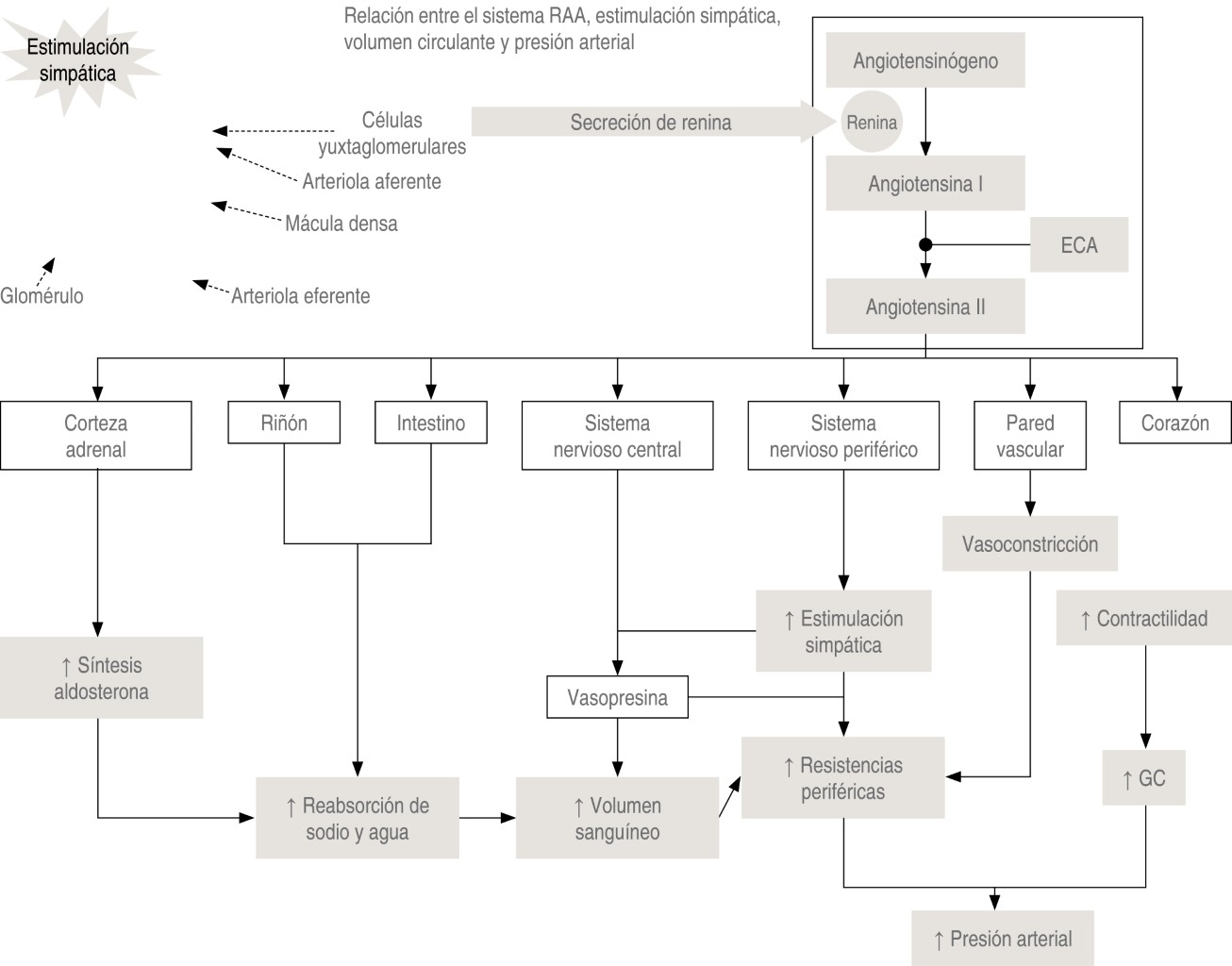 La hidrólisis del péptido precursor angiotensinógeno sintetizado en el hígado por la renina producida por las células yuxtaglomerulares por activación simpática forma un decapétido angiotensina I; la remoción de dos aminoácidos más por la acción de la enzima convertidora de angiotensina (ECA), resulta en la formación biológica del péptido activo angiotensina II, que ejerce su acción a través de su acoplamiento proteínico de dos receptores: AT1 y AT2. La sobrestimulación simpática produce elevación de AII ejerciendo su acción mediante los receptores AT1, e induce no sólo vasoconstricción arterial, sino también proliferación celular, inflamación, hipercoagulabilidad, síntesis de matriz extracelular y remodelación vascular, lo que explica en parte el daño en diversos órganos y las manifestaciones clínicas de la enfermedad cardiovascular.10-14
