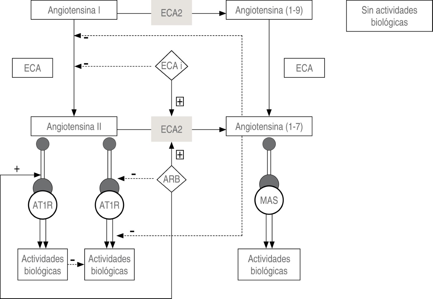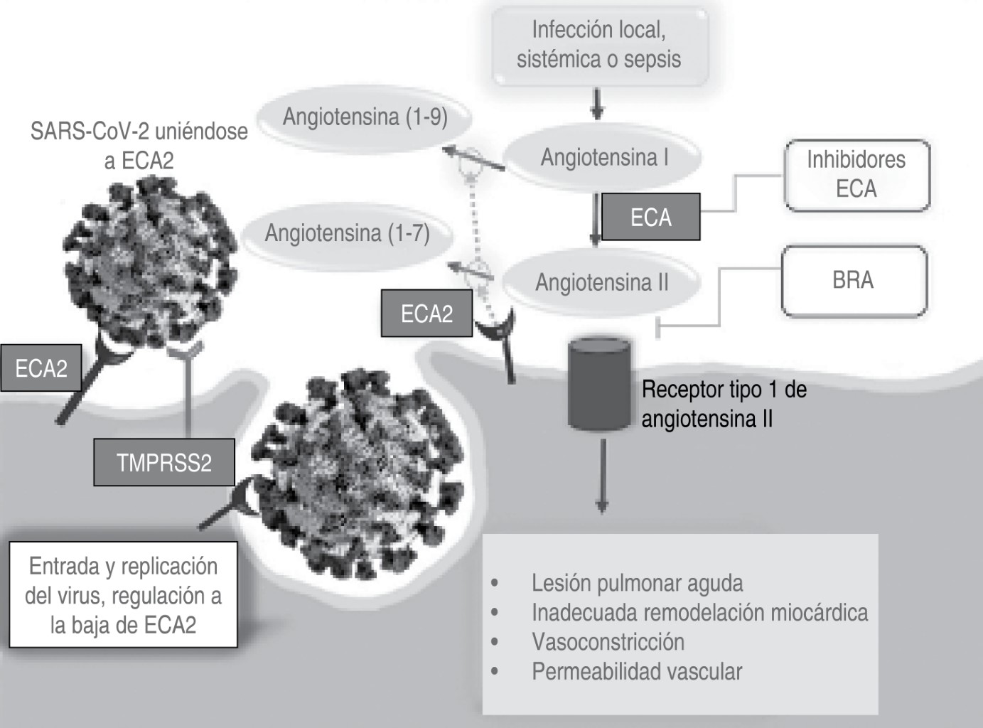 La sobrexpresión de la actividad simpática y del sistema renina angiotensina aldosterona tienen efecto deletéreo en el aparato cardiovascular: la hipertrofia ventricular izquierda, fibrosis miocárdica e insuficiencia cardiaca. La contrarregulación a través de la expresión del homólogo de la enzima convertidora de angiotensina 2 (ECA2) produce vasodilatación y limita el daño de la angiotensina II. El coronavirus SARS-CoV-2 utiliza esta enzima como receptor que, al unirse a la proteína TMPRSS2, facilita la entrada del virus a las células; en el aparato cardiovascular se han encontrado ocho tipos de célula blanco, de entre ellas el pericito es la más afectada y con ello se inicia un proceso de disfunción endotelial, inflamación y daño miocárdico. La magnitud de esta respuesta determina el pronóstico de la enfermedad. La hipertensión arterial es un factor de riesgo. El antecedente de daño miocárdico previo y la insuficiencia cardiaca son condiciones que incrementan la expresión y síntesis de la ECA2, por lo que facilita la replicación y propagación del virus, exagera la respuesta inflamatoria y las complicaciones que comprometen la vida. Ni los inhibidores de la ECA ni los antagonistas de los receptores AT1 aumentan la virulencia de este agente patógeno, por el contrario, la inhibición en la producción de angiotensina II limita el daño a órganos blanco como corazón y riñón. Los inhibidores de receptores AT1 evitan la progresión del daño miocárdico y con ello podrían disminuir la expresión de ECA2, por esto, a nivel universal, las sociedades médicas no aconsejan suspender estos fármacos.