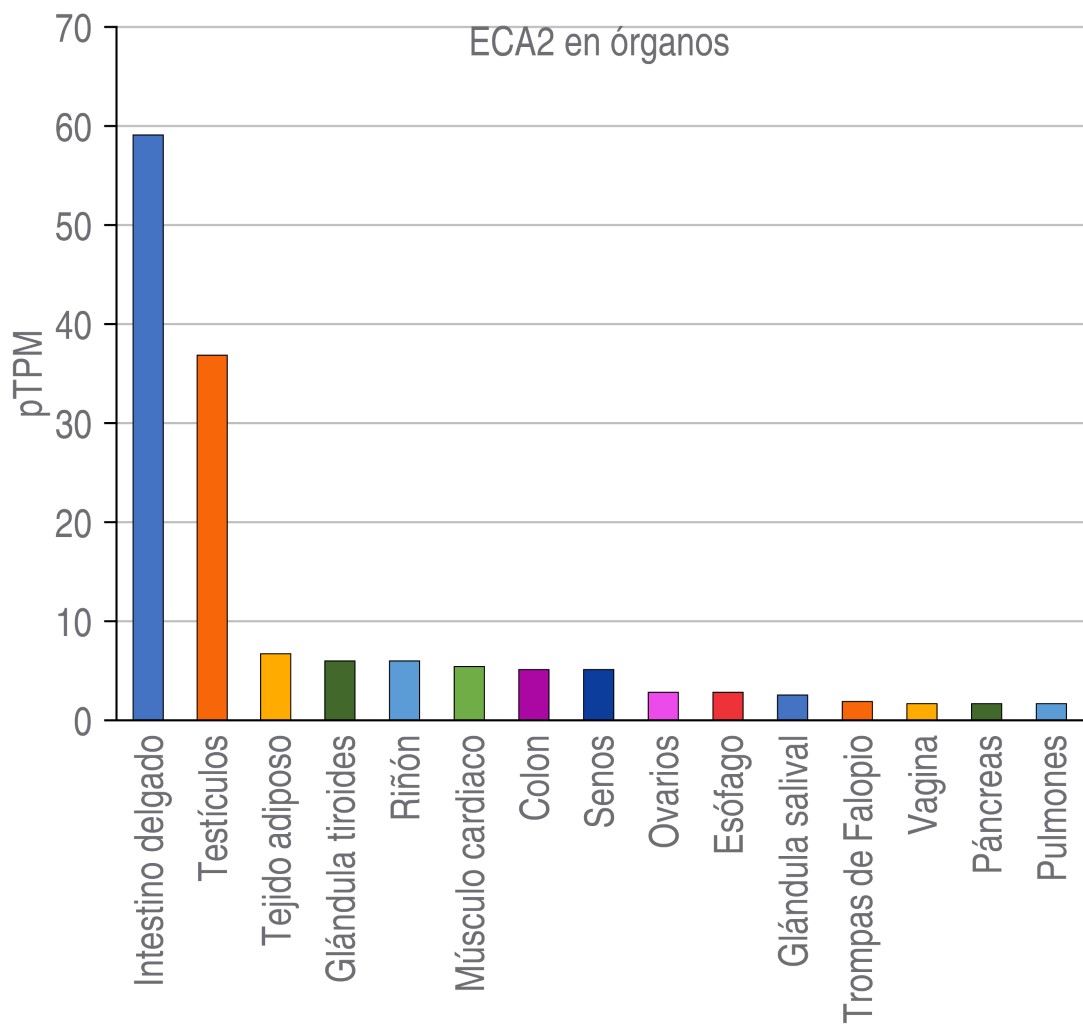 Sin embargo, la mayor expresión de RNAm para la síntesis de la ECA2 se ha encontrado en el intestino, testículos y el riñón, lo que explica la vulnerabilidad de estos órganos a la infección viral, así como la detección del mismo en la materia fecal. La expresión de la ECA2 en el corazón es menor que la de los intestinos, pero mayor que en el pulmón, principal órgano de choque, lo que sugiere que el aparato cardiovascular es un potencial sitio de infección25 (Figura 4).