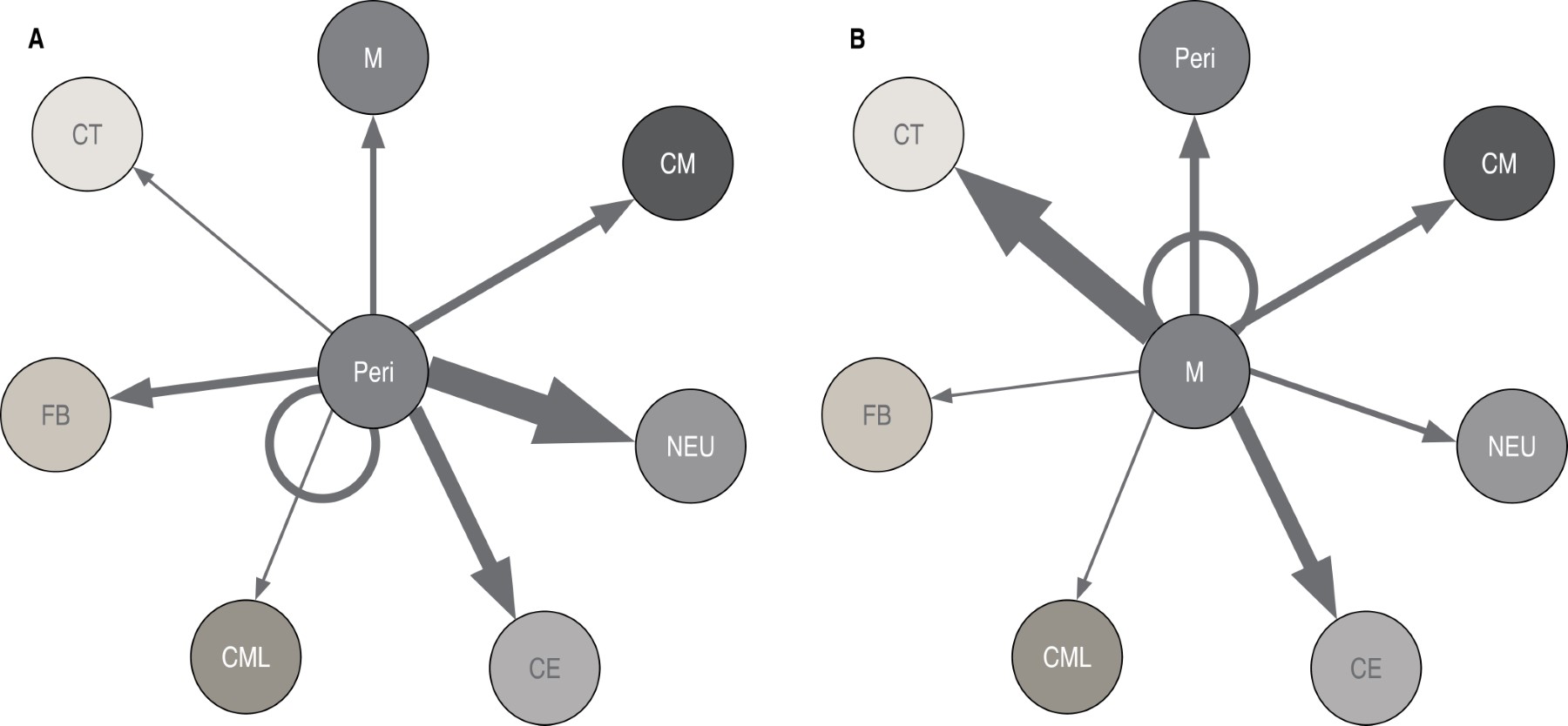 En modelos experimentales de corazón humano se han identificado por lo menos ocho diferentes tipos celulares que manifiestan los genes que expresan ECA2: células miocárdicas, células endoteliales, macrófagos, fibroblastos, pericitos, células musculares lisas, linfocitos T y células P (parecidas a las neuronas); de entre todas ellas la mayor expresión de esta ECA2 es en el pericito, lo que sugiere a este grupo celular como la célula huésped preferente del SARS-CoV-2 en el aparato cardiovascular25 (Figura 5).