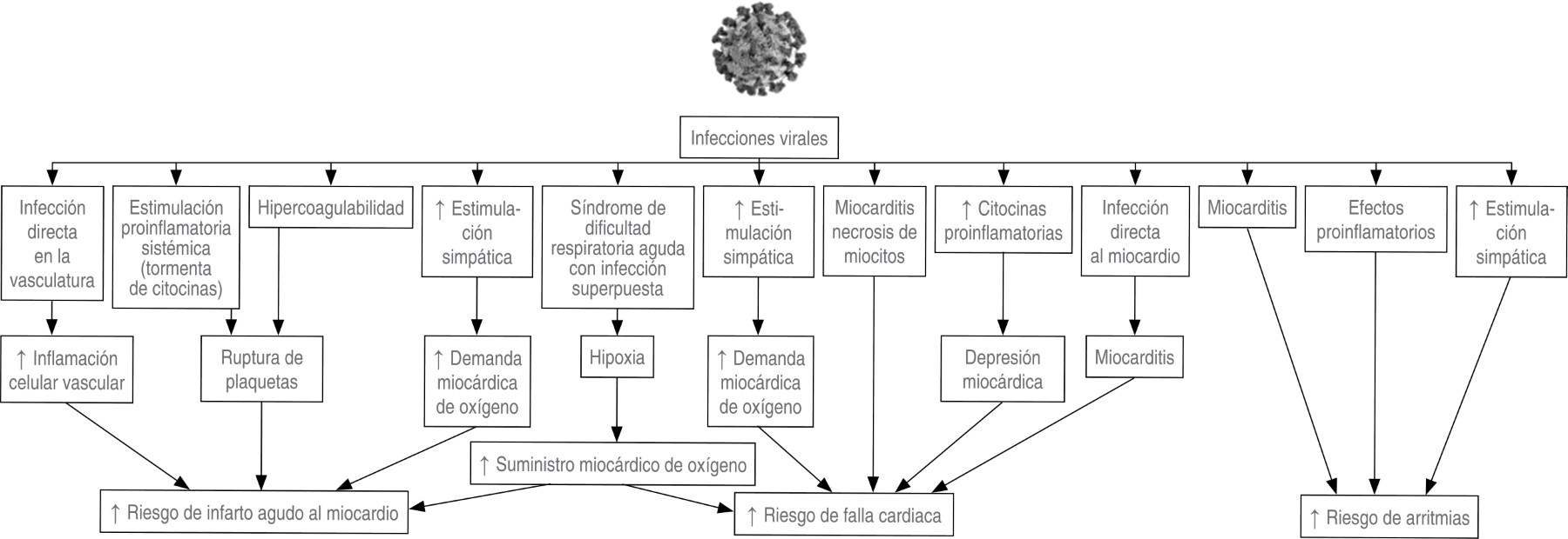 En diciembre del 2019, un nuevo tipo de neumonía con severa afección pulmonar aguda causado por la mutación de una variedad de síndrome respiratorio agudo grave coronavirus 2, fue por vez primera señalado en la Provincia de Wuhan, China.1 Aproximadamente, 20% de los enfermos desarrollaron insuficiencia respiratoria aguda y falla orgánica múltiple;2 de ellos, 23% tuvieron daño miocárdico,3 lo que ensombrece aún más la severidad de la enfermedad. Estudios experimentales sugieren que la proteína S del virus que en el espacio adquiere la forma de una espiga se une a la molécula homóloga de la enzima convertidora de angiotensina, 2 la cual sirve entonces como receptor de las células huésped; por lo que la expresión de enzima convertidora de angiotensina 2, así como su distribución en diversos tejidos, podrían ser determinantes de la severidad de la enfermedad. Los hallazgos experimentales en presencia de insuficiencia cardiaca demuestran un incremento en la expresión del RNAm que codifica para la síntesis de la enzima convertidora de riesgo de complicaciones que comprometan la vida.4 El objetivo de la presente revisión de la literatura es establecer la relación de daño a órgano blanco causado por el virus del síndrome respiratorio agudo grave coronavirus 2 y su probable relación con el sistema renina angiotensina aldosterona a través de la expresión del homólogo de enzima convertidora de angiotensina 2 con o sin daño miocárdico establecido.