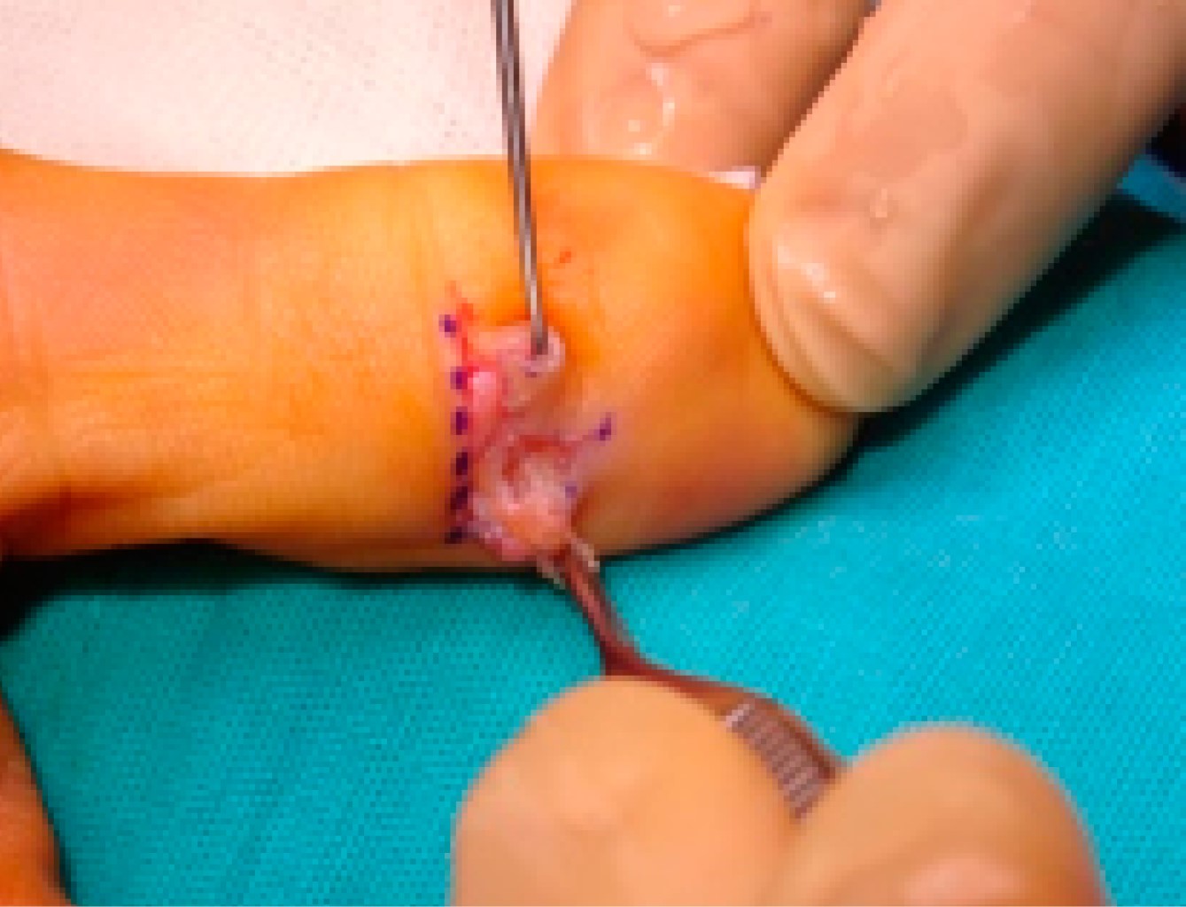Durante la preparación se realiza recorte del gancho para facilitar el acceso, así como la región a disecar (Figuras 1 y 2), se localiza la punta del gancho anclado al nervio digital cubital paquete neurovascular (Figura 3), siendo posible retirarlo manteniendo íntegra la arteria y nervios digitales cubitales; además, se evidencia integridad de cápsula articular, se realiza lavado profuso de herida con solución salina al 0.9% y se procede a realizar cierre de herida por primera intención con puntos separados de nylon 4-0.