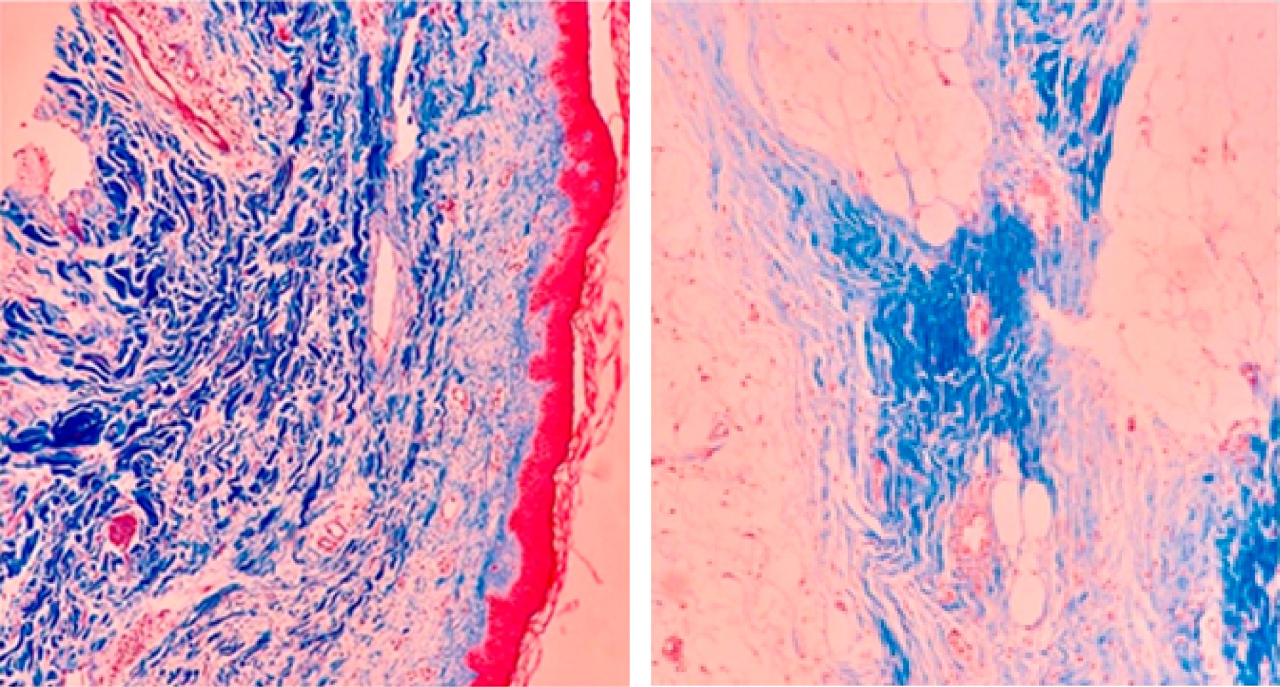 Se trata de una mujer de 51 años con antecedente de artritis reumatoide. En octubre de 2017 fue diagnosticada con cáncer de mama izquierda T1cN1M0 EC IIA, receptores de estrógeno y progesterona positivos, Her-2/neu negativo, Ki-67 20%. Recibió quimioterapia neoadyuvante con doxorrubicina/ciclofosfamida (cuatro ciclos) y docetaxel (cuatro ciclos). En julio de 2018 fue sometida a cirugía conservadora de mama izquierda y disección ganglionar axilar, con reporte histopatológico de carcinoma ductal infiltrante, grado histológico II, con un tamaño del lecho tumoral de 18 × 15 × 15 mm, fibrosis parcial en 2/20 ganglios linfáticos. Recibió radioterapia adyuvante a mama izquierda + regiones ganglionares ipsilaterales, dosis 50 Gy en 25 sesiones y boost al lecho quirúrgico de 10 Gy en 5 sesiones, finalizando en octubre de 2018. Durante el tratamiento presentó radiodermitis grado I (RTOG/EORTC). También inició tamoxifeno adyuvante. En enero de 2019, tres meses después de finalizar el tratamiento, presentó dolor ardoroso localizado en la mama izquierda de moderada intensidad, acompañado de eritema, engrosamiento y edema de la piel. No tuvo secreciones anormales, fiebre o escalofríos. Clínicamente tenía la mama izquierda retraída, indurada, con eritema brillante, aumento de la temperatura y aspecto de piel de naranja (Figura 1). Recibió tratamiento antibiótico, analgésico y antiinflamatorio sin mejoría. En febrero de 2019 tomamos una biopsia de piel y tejido celular subcutáneo con reporte histopatológico de epidermis adelgazada y atrófica. En la dermis papilar y reticular se observó extensa fibrosis compuesta por fibras de colágena engrosadas, que se disponen de forma irregular y que rodean los filetes nerviosos con sólo un folículo piloso atrófico y ausencia de anexos. La fibrosis se extiende hasta el tejido celular subcutáneo rodeando un grupo de glándulas ecrinas con zonas de hialinización. Hay leve infiltrado linfoide perivascular. Con la tinción tricrómica de Masson se evidencia fibrosis en dermis y bandas que se extienden hasta el tejido celular subcutáneo. No se identificaron células atípicas (Figura 2). Al descartarse recurrencia se dejó tratamiento tópico con esteroides y antiinflamatorios sistémicos, mejorando notablemente el cuadro.