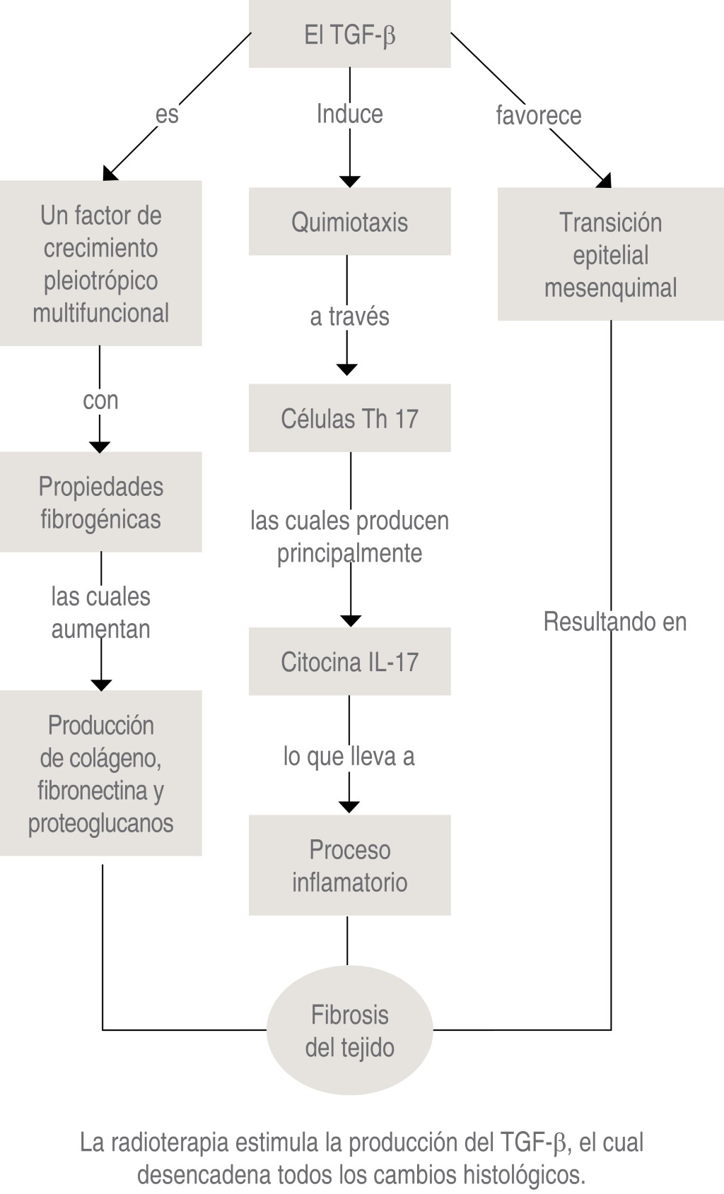 La fisiopatología no está clara, algunas teorías mencionan que las citocinas TGF-β (factor de crecimiento transformante beta), PDGF (factor de crecimiento derivado de plaquetas) y CTGF (factor de crecimiento de tejido conectivo) son liberadas por los infiltrados inflamatorios provocando la activación de las células mesenquimales, ocasionando lesiones a componentes celulares (fibroblastos y células endoteliales) que desregulan la producción del colágeno. Lo anterior promueve la creación de un neoantígeno inducido por radiación, que se traduce en una secreción patógena de TGF-β, la cual activa a los fibroblastos y éstos se encargan de aumentar la síntesis de colágeno y provocar la fibrosis subsecuente (Figura 3). La vía regulada por TGF-β representa un poderoso estímulo para la proliferación de fibroblastos y utilización de matriz extracelular. La matriz extracelular es una superestructura compuesta de moléculas que incluyen fibronectina, colágeno y proteoglicanos. El TGF-β1 (subtipo del TGF-β) ha sido identificado como el interruptor maestro en la inducción del epitelio mesenquimatoso de transición que conduce a la conversión diferencial de células epiteliales a fibroblastos y miofibroblastos, provocando sobreproducción de colágeno y fibronectina. Al mismo tiempo, estimula la producción de los componentes de la matriz extracelular, promueve su utilización y disminuye la liberación de proteasas, las cuales degradan la estructura de la matriz extracelular, ocasionando fibrosis. Además, el TGF-β1 induce la expresión de genes diana tales como el CTGF, la actina del músculo liso (α-SMA) y el inhibidor del activador del plasminógeno (PAI). Estos genes tienen como objetivo inducir quimioatracción, proliferación y diferenciación de fibroblastos y miofibroblastos. Los fibroblastos desempeñan un papel crucial en la regulación de la fibrosis y en la respuesta inmunológica después de la activación del TGF-β1.13,14
