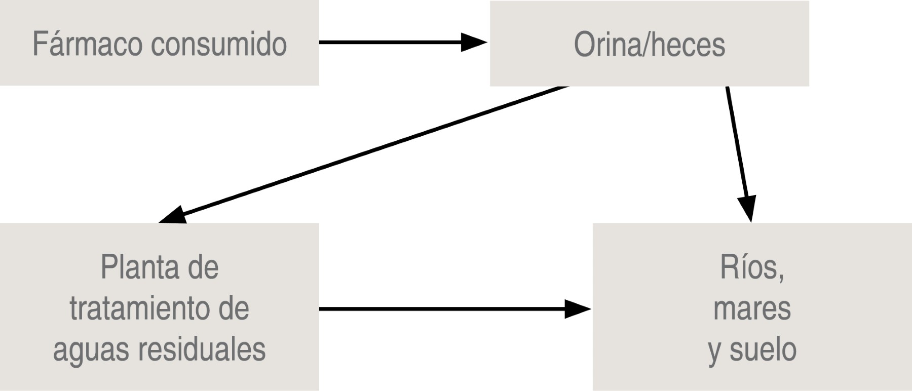 En la Figura 2 se esquematiza el proceso de todo fármaco producido, ya sea ingerido o no, por el ser humano o los animales y su impacto en la naturaleza. Irremediablemente llegará toda la sustancia activa o un porcentaje de ella al suelo y al agua, dependiendo de cómo se deseche y de la farmacocinética/farmacodinamia del propio medicamento, produciendo un efecto negativo en los microorganismos y organismos con los que interactúe. El que hoy la ecotoxicidad y la ecofarmacovigilancia sean un campo de acción "nuevo" no limita nuestra responsabilidad como médico de seres humanos o de animales, del conocimiento del daño que se produce en tierra y agua por un manejo inadecuado del residuo.13