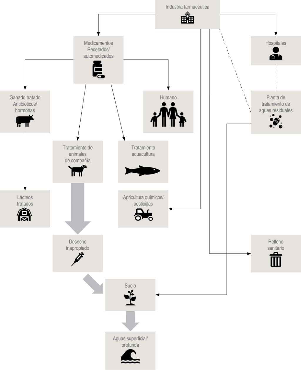 Peake y colaboradores8 en su libro analizan ampliamente los estudios hasta ahora publicados alrededor del mundo, llegando a la conclusión de que toda el agua dulce superficial del planeta tiene alguna sustancia activa producto del desecho inadecuado de los medicamentos. De hecho, parte de la resistencia antimicrobiana existente en el ámbito mundial es debido a las dosis de antibióticos que ingresan al agua del planeta por el desecho inadecuado de heces de ganado, acuacultura y del ser humano y se asume que como son dosis bajas al ser humano no le produce ningún efecto; sin embargo, a especies de menor peso y características diferentes sí.5,8,20-24