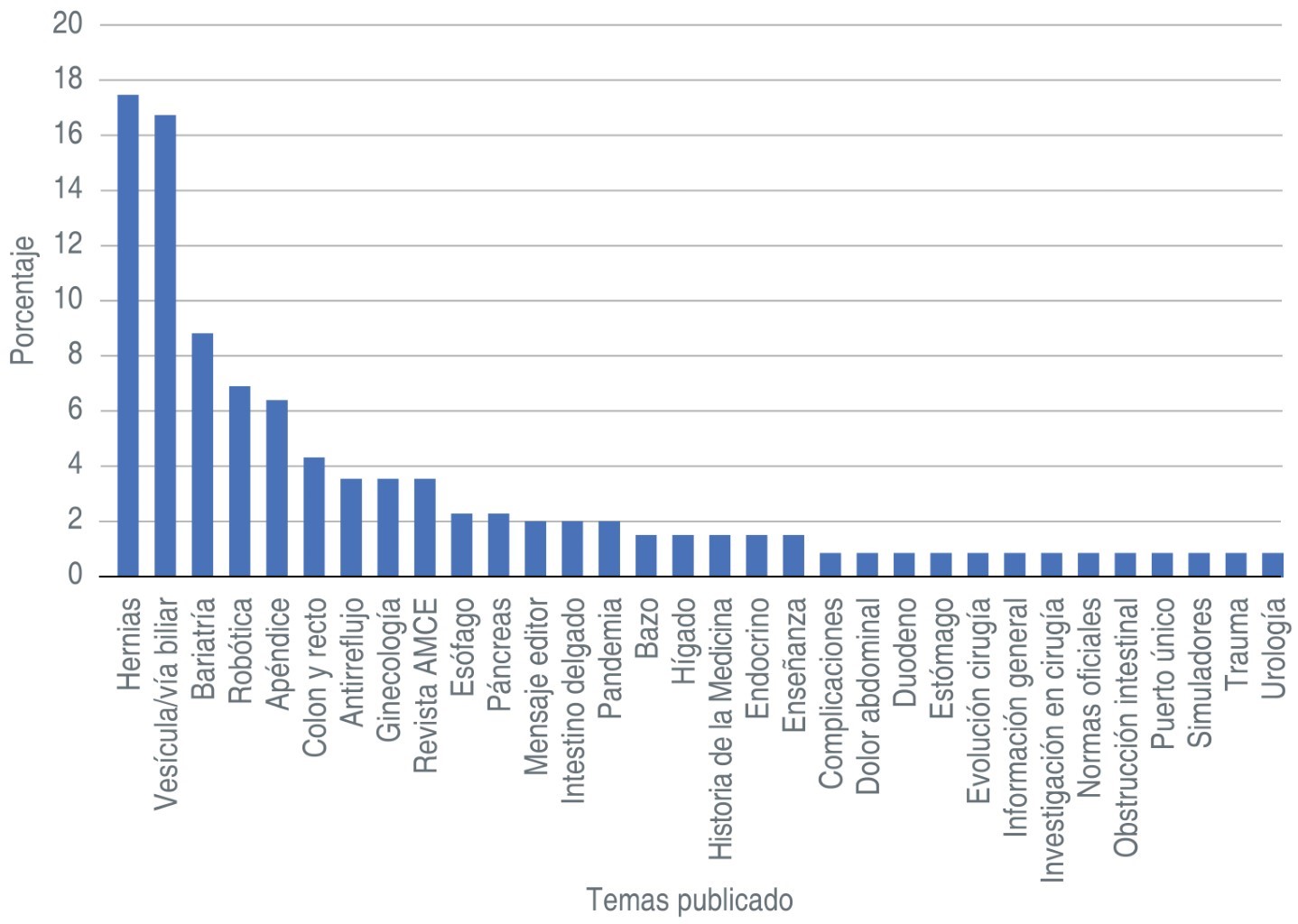 Los títulos de los artículos se clasificaron de acuerdo con su tema general y de esta manera se registraron más de 30 diferentes. Los temas que predominaron fueron: cirugía de hernias (17.7%), cirugía de vesícula y vías biliares (17%), cirugía bariátrica (8.5%), cirugía robótica (7%) y cirugía de apéndice (6.4%). Ningún otro tema sobrepasó 4% de los contenidos publicados (Figura 1).