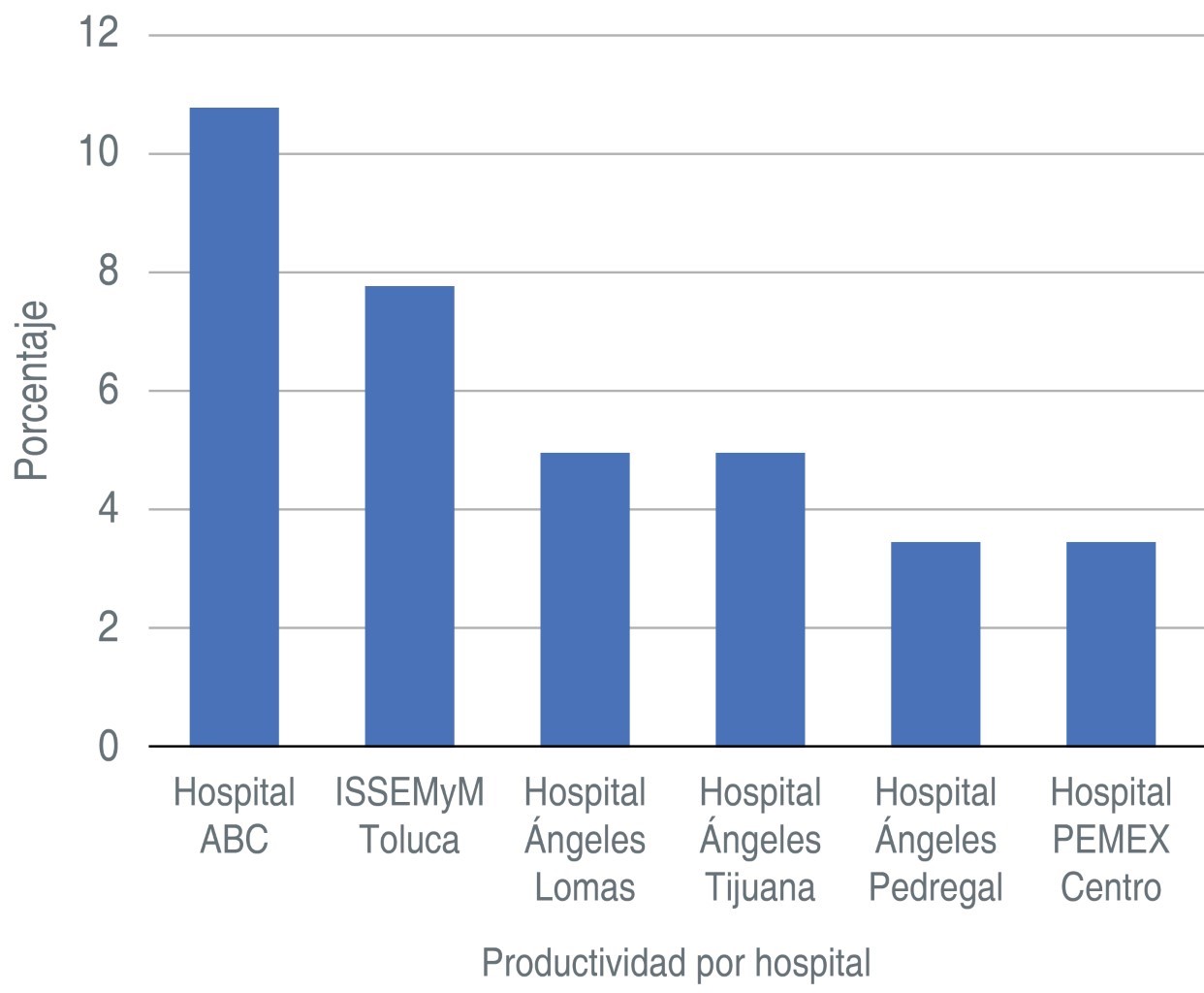 Entre las instituciones públicas predominó el Hospital ISSEMyM de Toluca con 8% del total de publicaciones y entre las privadas, el Hospital ABC con 11%, seguido de los hospitales del Grupo Ángeles Servicios de Salud (Lomas, Tijuana y Pedregal) que en conjunto representaron 14% (Figura 3). Ningún otro hospital del país sobrepasó 3% del total.