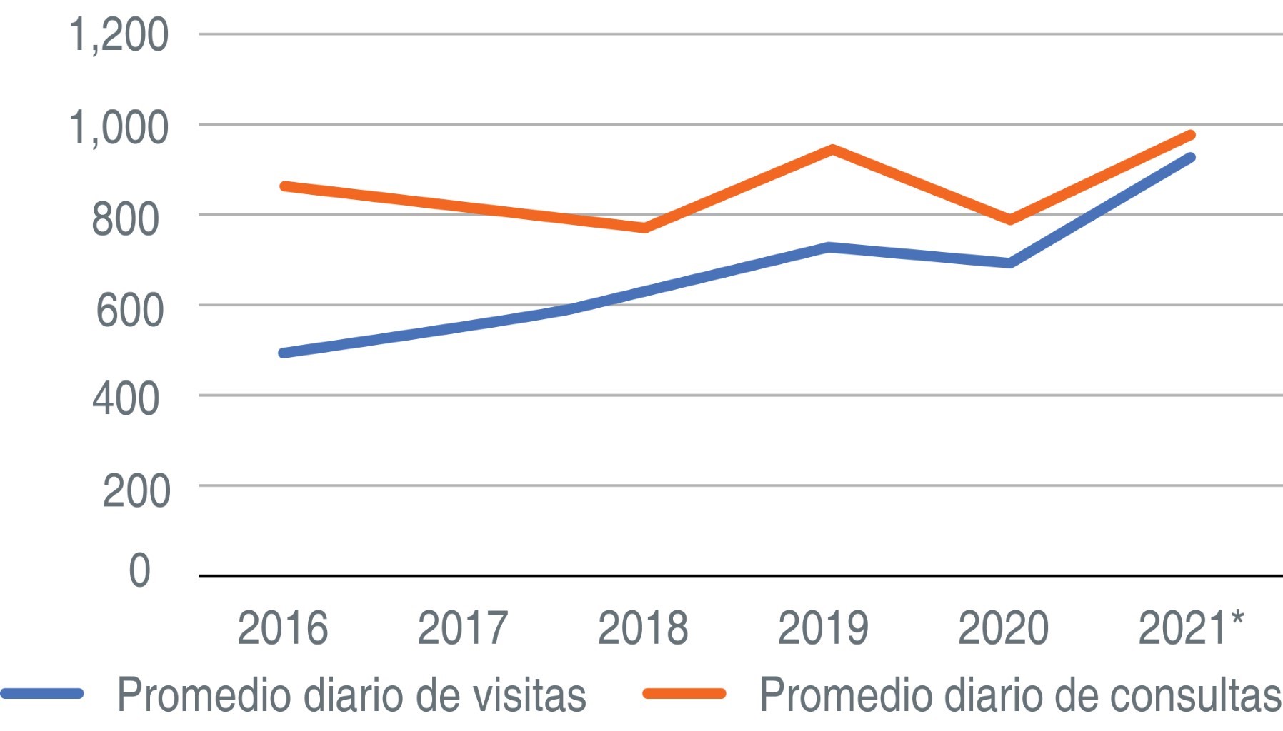 En el periodo estudiado, se registraron en promedio 616 visitas y 835 consultas diarias a la revista. La Figura 4 muestra el comportamiento de visitas y consultas en los últimos cinco años.