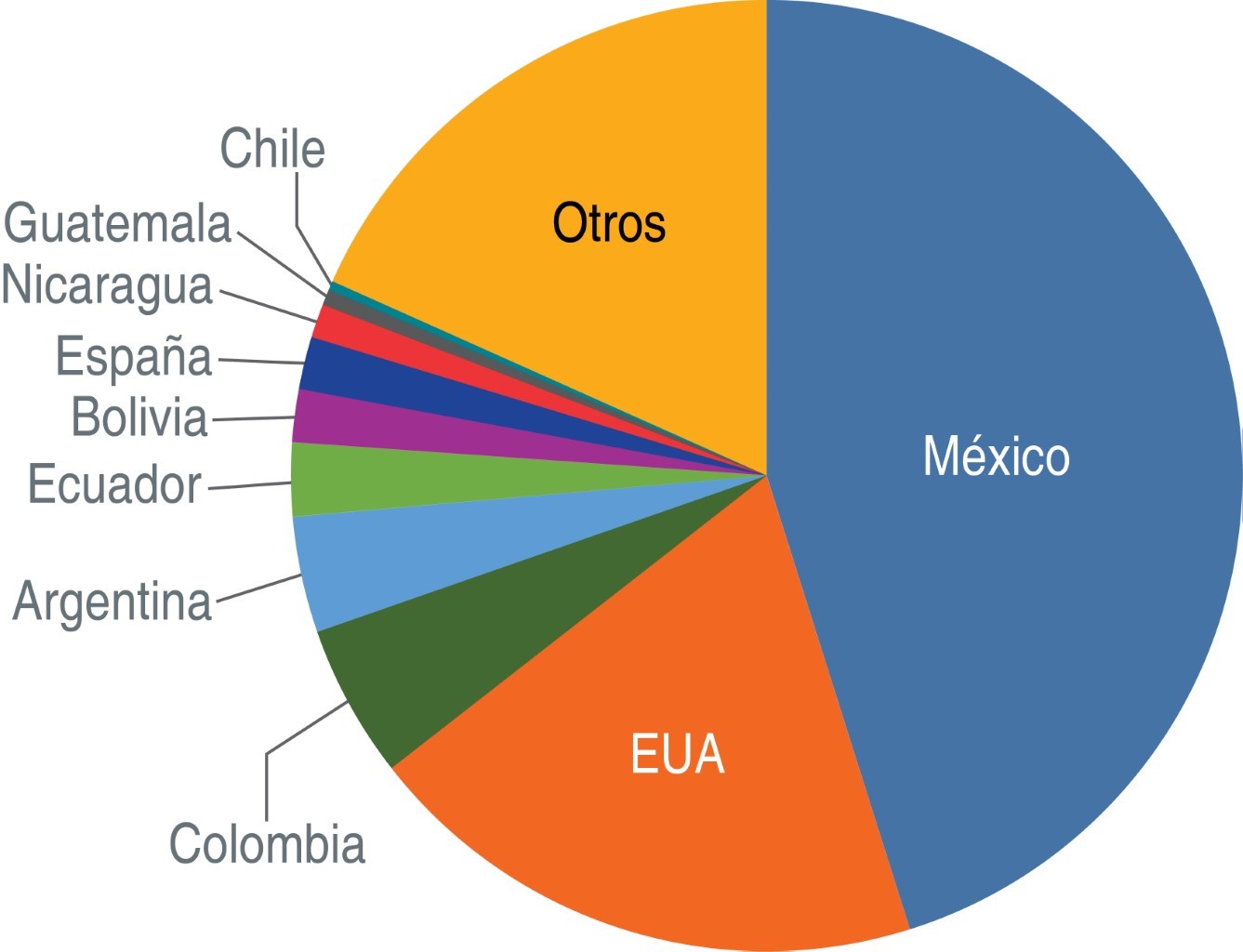 México y los Estados Unidos de Norteamérica son los países que más consultan los artículos de la revista, con 44.3 y 20.8% de las consultas, respectivamente. Además, se registran consultas en Colombia, Argentina, Ecuador, Bolivia, Nicaragua, Guatemala, Chile y España, entre otros (Figura 5).