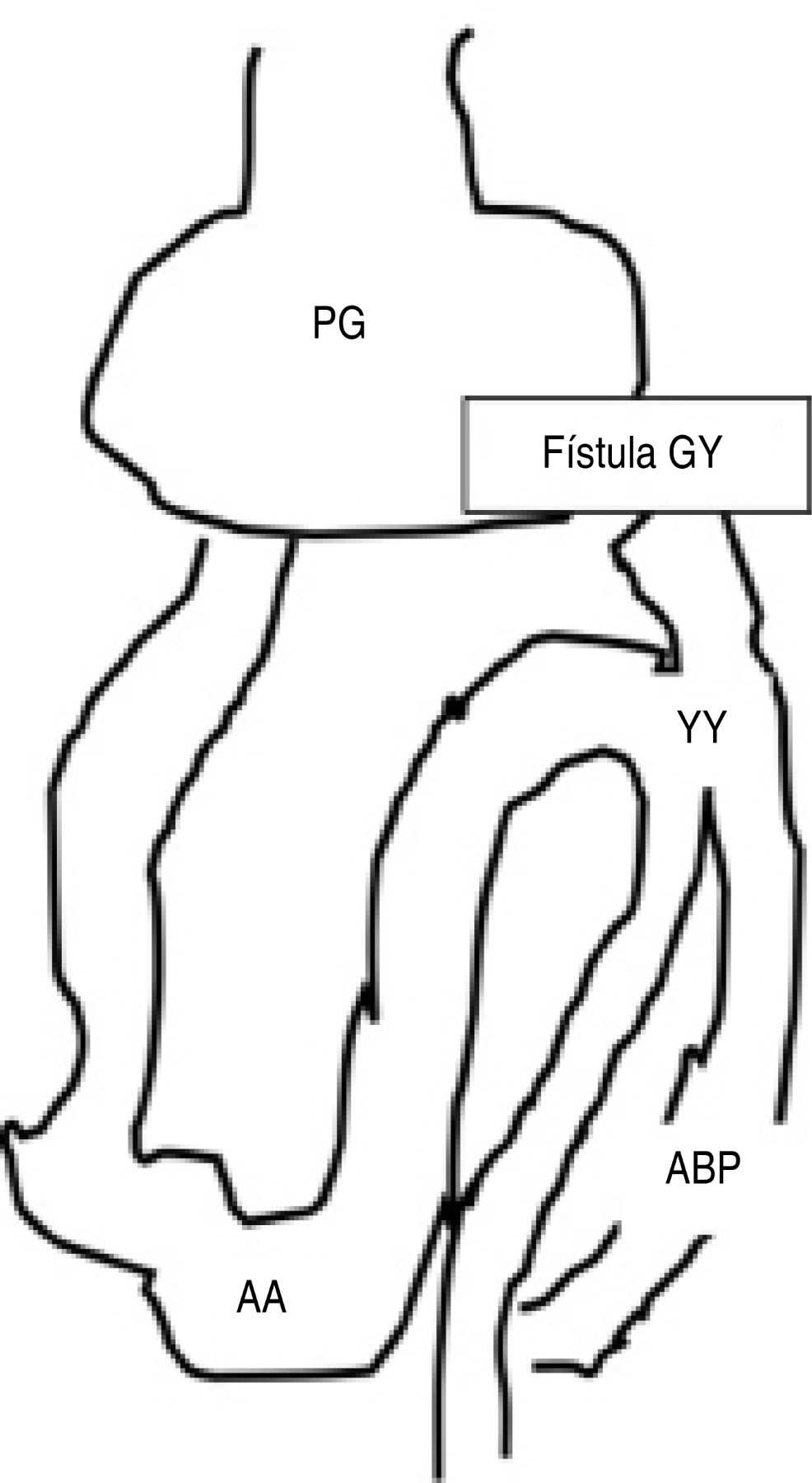 La presencia de una fístula gastroyeyunal, hasta donde sabemos, no ha sido reportada en pacientes con bypass gástrico, siendo las más comunes las gastrogástricas. El mecanismo fisiopatológico propuesto para esta nueva complicación es la manifestación de un proceso inflamatorio a nivel del pouch gástrico, debido al antecedente de la úlcera de boca anastomótica, la cual favoreció la formación de la fístula (Figura 5). El caso fue resuelto por medio de fistulectomía con cierre primario del pouch gástrico y la paciente tuvo una evolución satisfactoria.