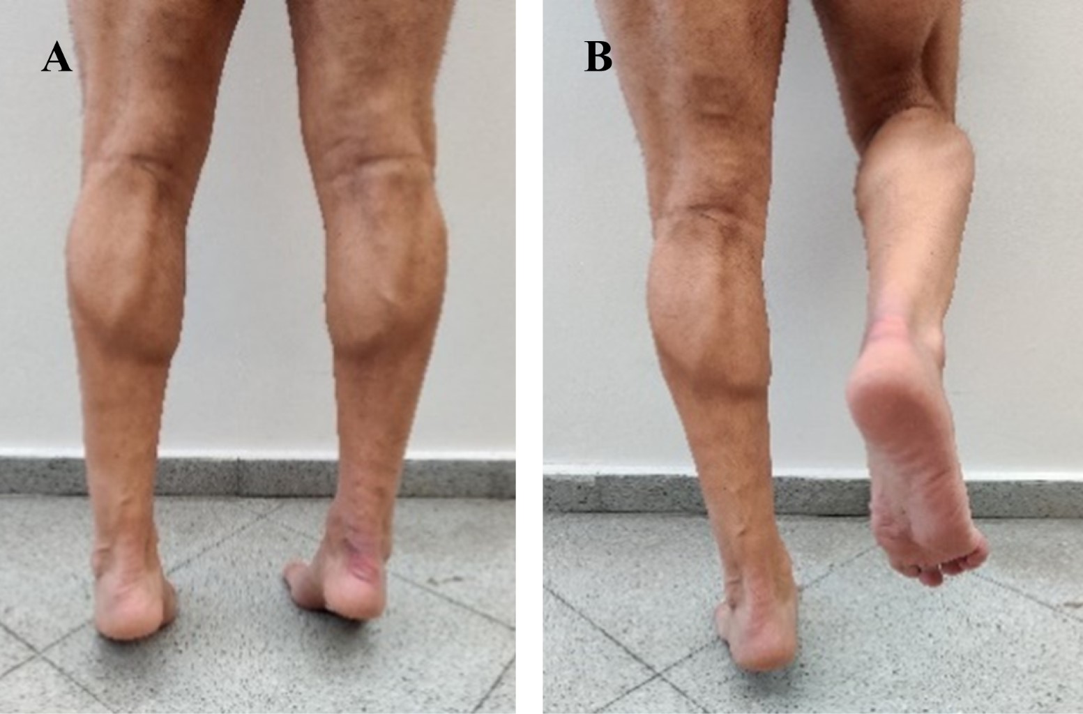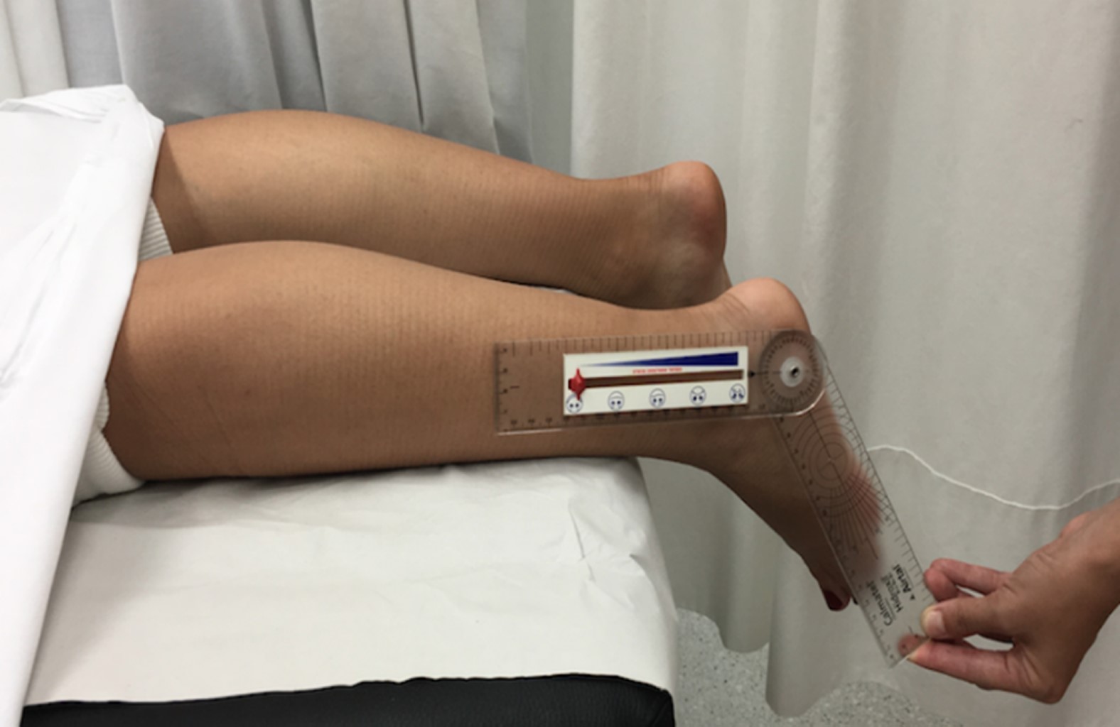 Se analizaron las variables demográficas, la escala ATRS (Achilles tendon Total Rupture Score),10 la función mediante la realización de puntillas bipodal y monopodales y permanecer en dicha posición durante tres segundos (Figura 1),11,12 la diferencia de masa muscular gemelar entre ambas extremidades, la diferencia de equino residual en reposo comparándola con la extremidad sana13 (Figura 2) y la vuelta a la práctica de actividad deportiva. La muestra total inicial fue de 19 pacientes con seguimiento clínico-funcional a las seis semanas, tres, seis y 12 meses y la recogida de datos se realizó a los 6 y 12 meses. Los resultados se analizaron estadísticamente mediante Stata 14. Se compararon los resultados a los seis y 12 meses mediante el test de McNemar para las variables cualitativas y la prueba t-Student para las variables cuantitativas continuas. Las diferencias se consideraron estadísticamente significativas si p < 0.05.