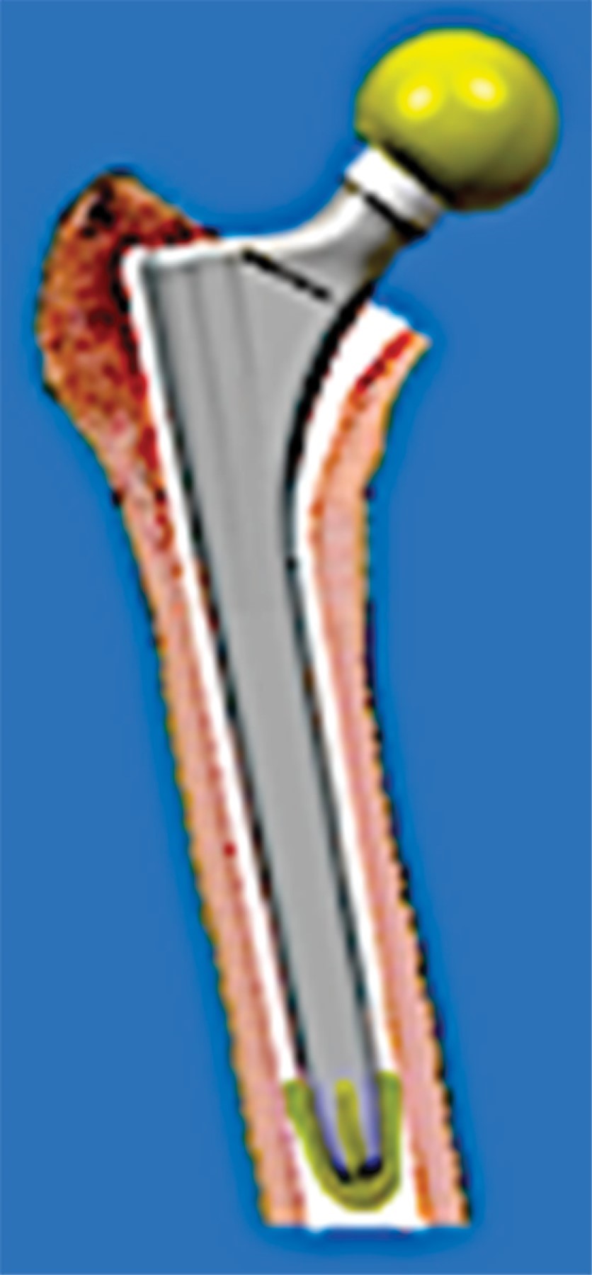 Casi a finales del siglo pasado en Estados Unidos (EU) se desarrollaron varios diseños de implantes no cementados con diferentes métodos de fijación. Uno de los primeros vástagos no cementados que se aprobó por la FDA en 1985 fue el vástago AML® fabricado en Co-Cr-Mo, de geometría cilíndrica distal, con collar, casi totalmente revestido, diseñado para la fijación diafisaria. Los inconvenientes a largo plazo de este vástago fueron que frecuentemente se presentaba dolor en el muslo y por lo general ocurría una pérdida de hueso femoral proximal con hipertrofia distal (Stress shielding).