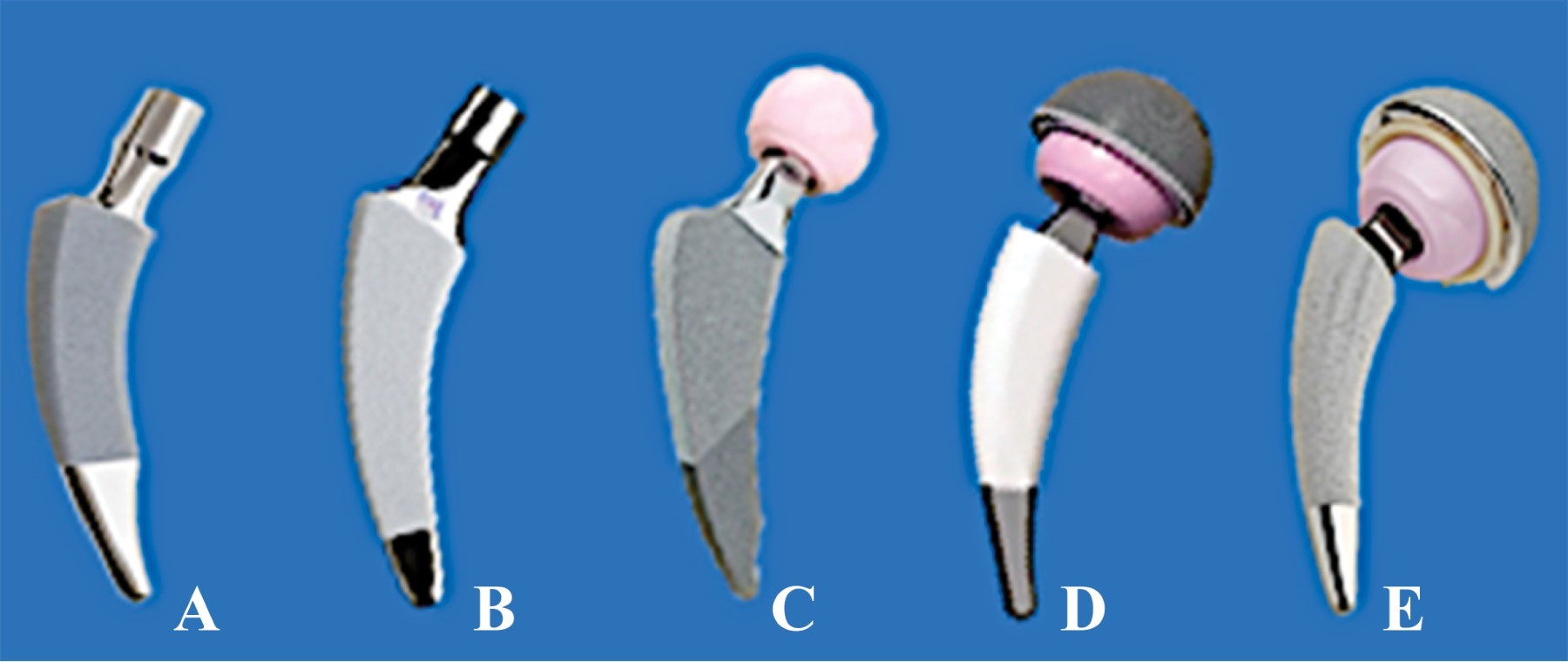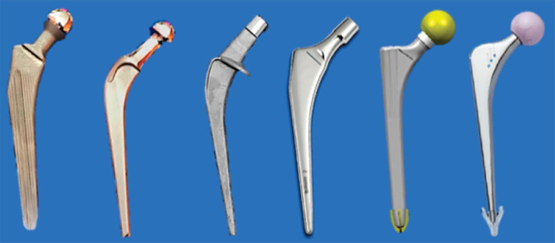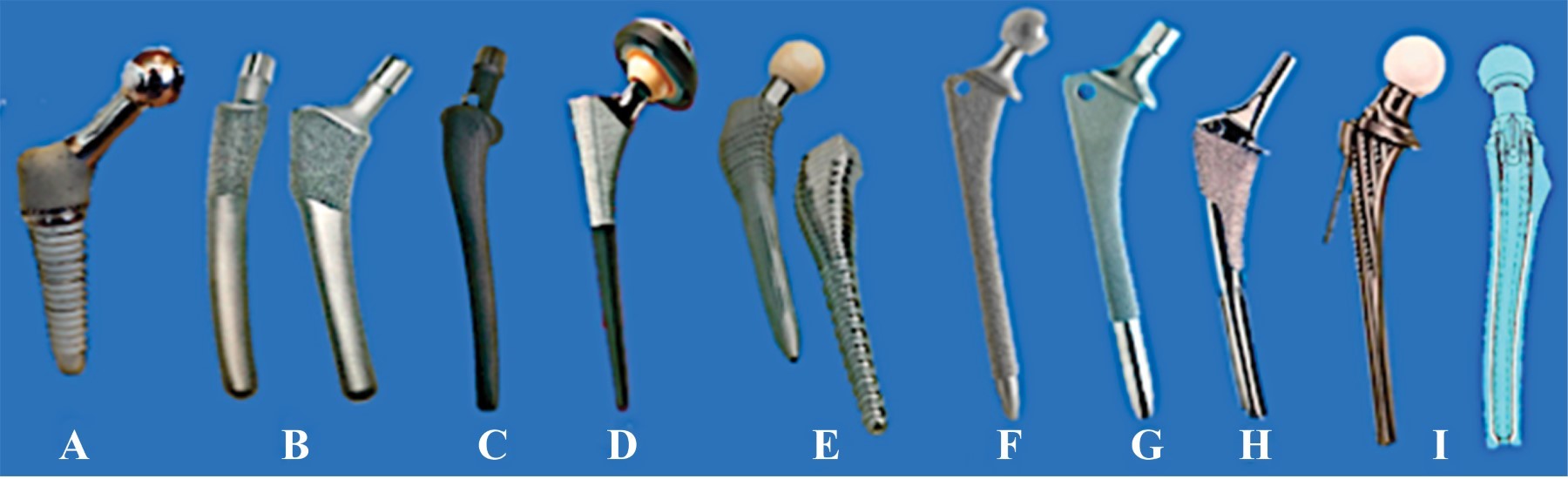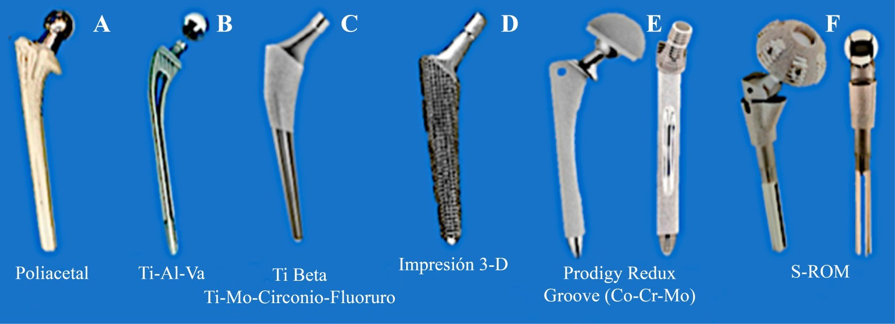 Con el objetivo de mejorar la estabilidad, en el desarrollo histórico de la artroplastía se han diseñado diversos tipos de vástagos no cementados; mencionaremos los siguientes: rectos, curvos, anatómicos, roscados, hechos a la medida, recubiertos totales, intermedios y cortos, híbridos, etcétera (Figura 7).