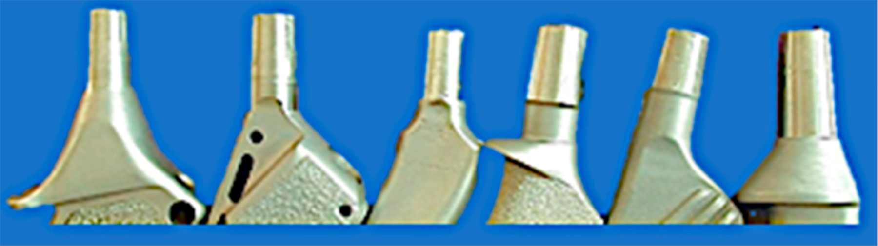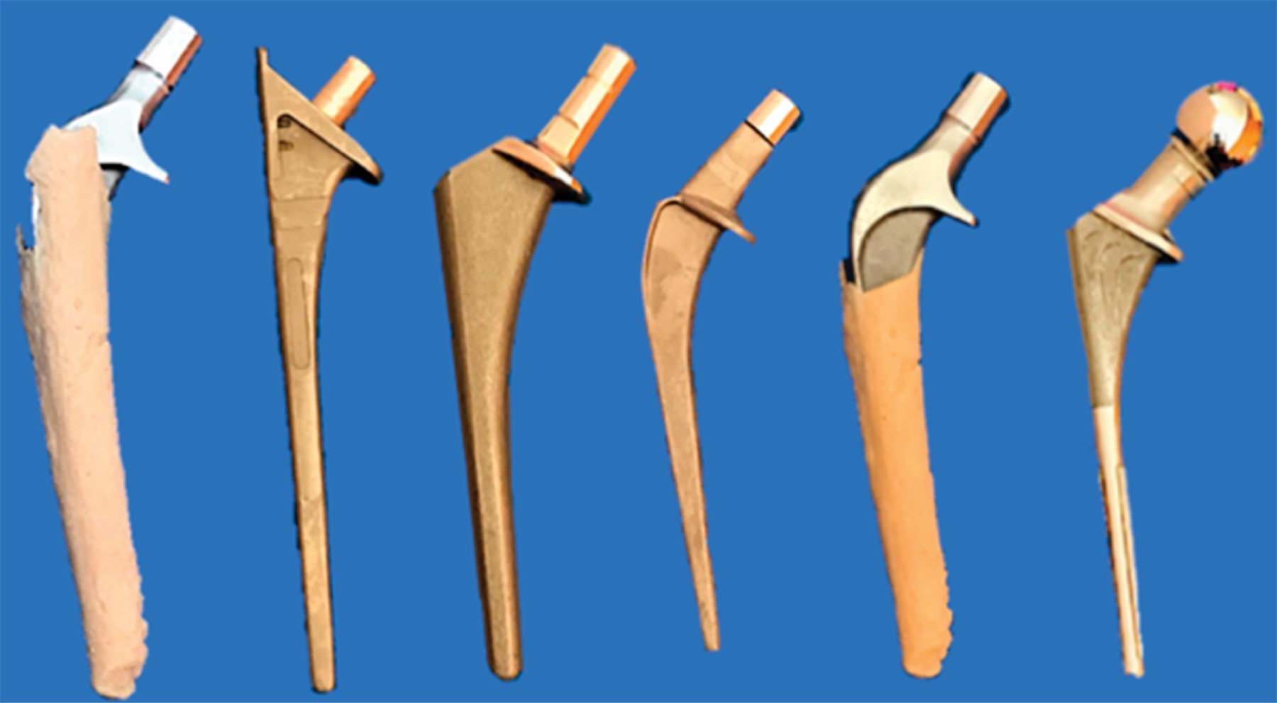 Ya se ha mencionado que históricamente ha habido una verdadera explosión de diseños de los componentes femorales cementados y no cementados. Todos han tenido como objetivo común tratar de mejorar su buen funcionamiento a largo plazo a través de atacar diversas variables en su diseño, materiales, fabricación e instrumentación. La Figura 6 muestra sólo algunos ejemplos de la diversidad de diseños actualmente en desuso.