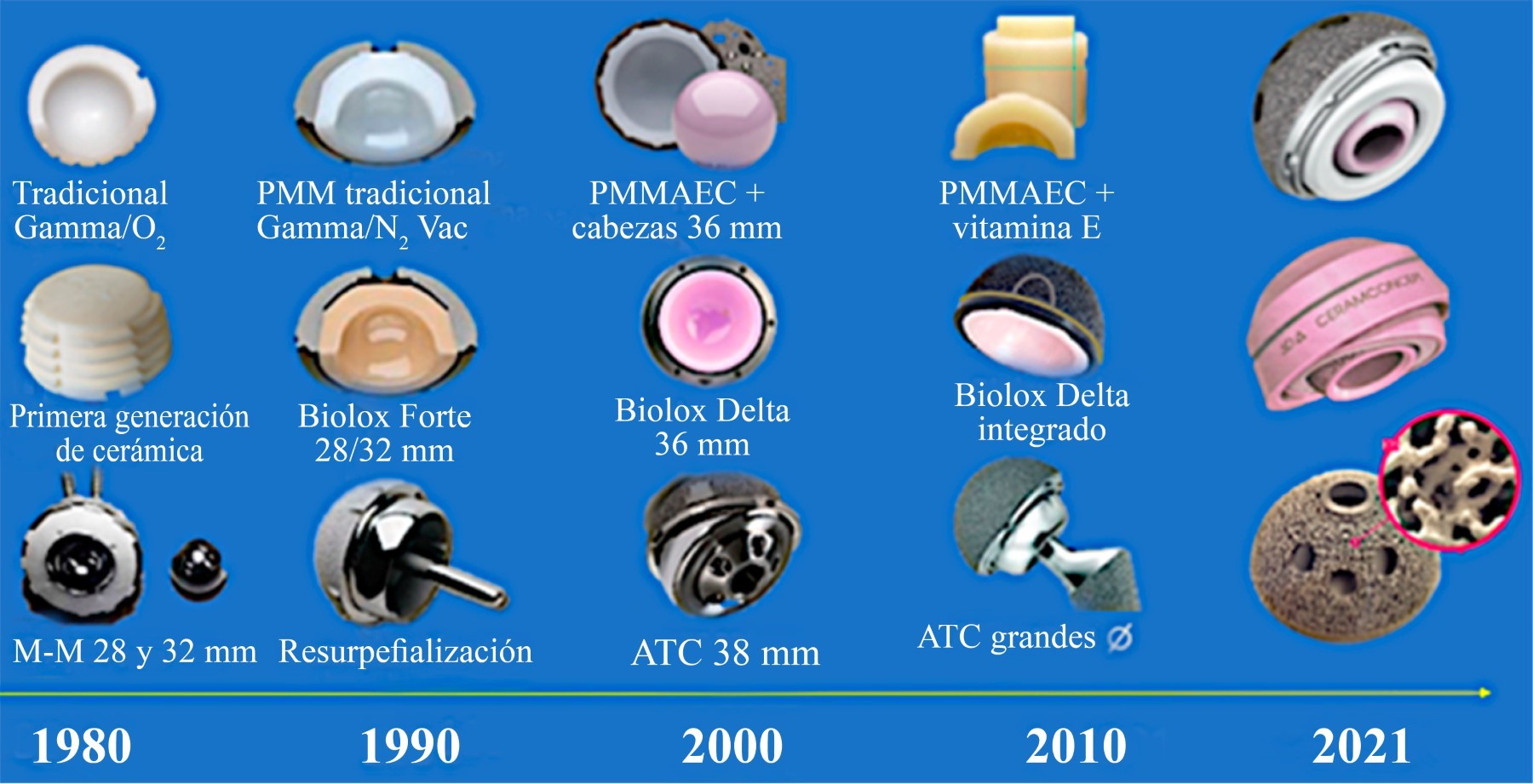 Aprovecharemos este espacio para mencionar que a finales de los 70 y principios de los 80 aparecen nuevos materiales como son las cerámicas alúmina y delta, tantalio, esquitita, metales ceramizados como el oxinium y otros más. Asimismo, se desarrollan avances tecnológicos en la fabricación y aplicación de este recurso como la ya mencionada impresión en 3-D, la cirugía asistida por computadora (navegación y robótica), inteligencia artificial, mínima invasión, artroscopía de cadera, nuevas herramientas de planificación y ejecución quirúrgica y modificaciones a las vías de abordaje.