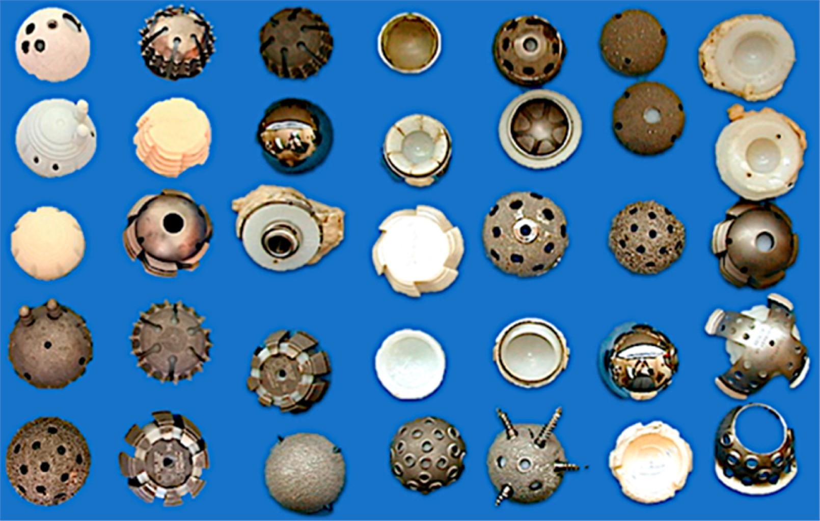 En cuatro décadas de historia del desarrollo de implantes acetabulares, han ocurrido cambios en materiales, geometrías y diseños (Figuras 4 y 5); mencionaremos: el polietileno de alta densidad esterilizado con diferentes métodos, la aparición de diferentes tipos de cerámicas, diversos diseños de plataformas metálicas, la aparición de cabezas/insertos con grandes diámetros, de polietilenos de ultra alta densidad con elevado entrecruzamiento de radicales libres, la integración de la cerámica al metal, el surgimiento de modelos totalmente en cerámica, la doble movilidad y la impresión en 3-D.