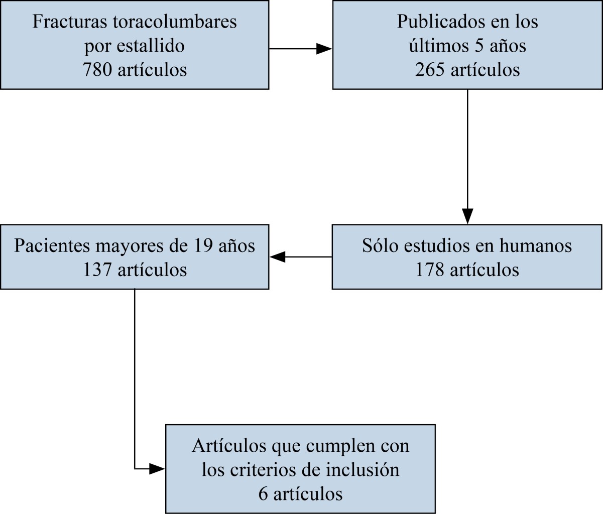 Estrategia de búsqueda: se realizó una búsqueda sistemática en los sitios PubMed, Cochrane y MedlinePlus para estudios publicados hasta la actualidad. Las palabras clave que se han utilizado fueron "Thoracolumbar Burst Fractures". Luego de la búsqueda inicial, se fueron estableciendo diferentes filtros para lograr un trabajo representativo y aplicable en nuestra población. Hemos filtrado por artículos publicados en los últimos cinco años, realizados en humanos y en mayores de 19 años de edad. Las listas de referencias de artículos seleccionados se revisaron manualmente para buscar citas con potencial relevancia hasta que no se encontraron artículos adicionales. Todos los análisis se basaron en estudios publicados previamente; por lo tanto, no hubo aprobación ética ni consentimiento del paciente necesario.
