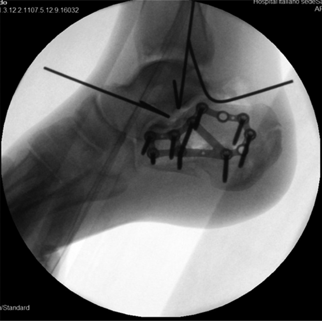 Se decidió realizar primero la reducción del calcáneo mediante clavijas y posteriormente osteosíntesis con placa para calcáneo SCP bloqueada de 3.5 mm (South American Implants, Argentina). Se constató adecuada reducción mediante el intensificador de imágenes (Figura 4). Aprovechando el mismo abordaje, se exploraron los ligamentos LPAA y LPC. Ambos presentaban signos de ruptura aguda, cercanos a su inserción proximal. Se realizó la reconstrucción ligamentaria utilizando anclajes con suturas transóseas al peroné distal. Se constató una adecuada estabilidad ante maniobras de estrés.