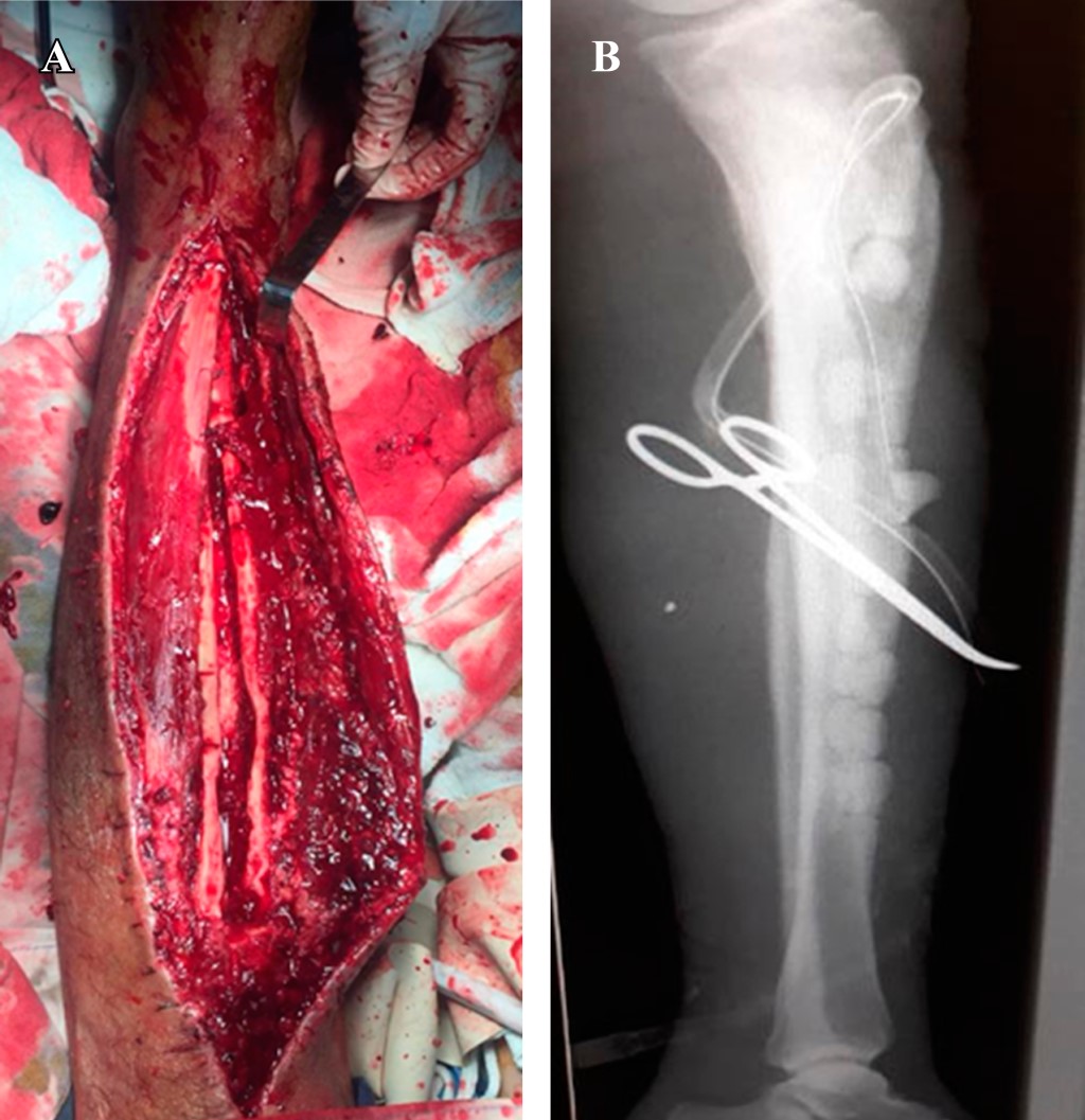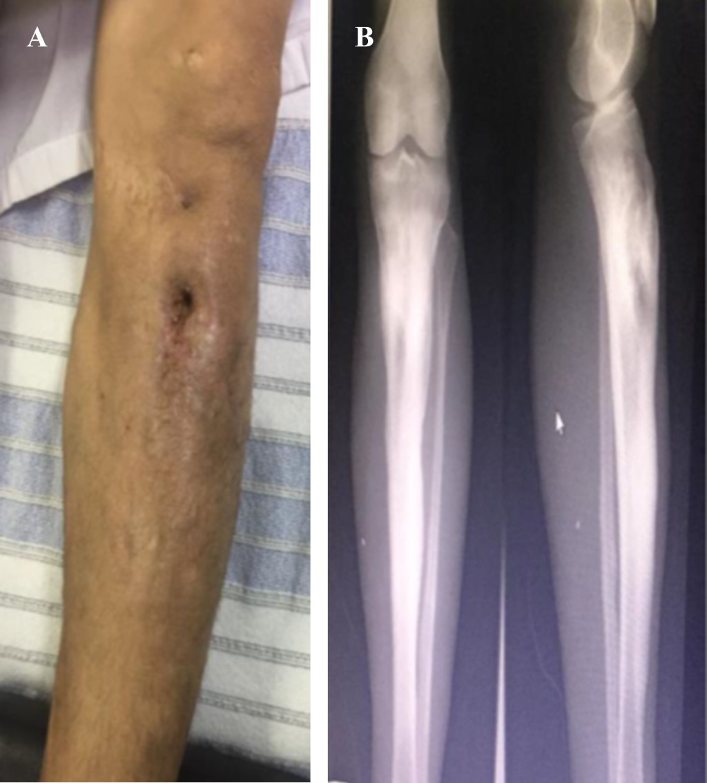 Masculino de 42 años, ocupación campesino. Acude a consulta por presentar secreción fétida y úlcera a nivel pretibial de pierna izquierda. Anamnesis: inicia padecimiento actual a la edad de 22 años de forma aguda e insidiosa con aumento de volumen y dolor en región metafisaria de tibia izquierda. Fue sometido a en tres ocasiones a aseos quirúrgicos y aplicación de múltiples antibióticos por períodos prolongados sin mejoría. Exploración física: presencia de fístulas en región metafisaria proximal 1 cm de diámetro, ambas con comunicación a canal medular y con exudado activo, purulento y fétido. Paraclínicos Hb 13 mg/dl, HTC 30%, Cr 2.3 mg/dl, Urea 40 mg/dl, cultivo de exudado de herida E. coli sensible a moxifloxacino y amikacina. En radiografía anteroposterior y lateral de pierna izquierda (Figura 1) se observa condensación de cortical anterior desde región metafisaria proximal hasta tercio distal de diáfisis tibial con la presencia de zona lítica de aproximadamente 3 cm en región metafisaria proximal. Tras estos hallazgos, se clasificó como osteomielitis crónica tibia tipo IV B de acuerdo al hospedario con enfermedad sistémica agregada e insuficiencia renal crónica. Se optó por un tratamiento quirúrgico definitivo en dos tiempos.