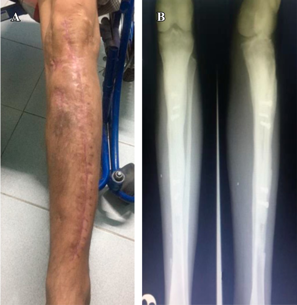 En el segundo tiempo quirúrgico se realiza toma de peroné libre no vascularizado, se fija y estabiliza con tornillos 4.5 de titanio con colocación de cuatro tornillos de una medida estándar de 30 mm, posteriormente se coloca el vidrio bioactivo en zonas de interface entre peroné estabilizado y cortical posterior de tibia en toda su longitud así como llenado total de cavidad medular en región metafisaria, (se utilizaron 16 g de vidrio bioactivo de 1 mm), se cierra herida quirúrgica y se le mantiene hospitalizado, se aplica amikacina 250 mg c/12 horas y moxifloxacino 400 mg cada 24 horas. Egresa del hospital cinco días después de segunda intervención quirúrgica con herida en fase de cicatrización, fístulas cerradas sin gasto, se indica antibiótico moxifloxacino 400 mg vo cada 24 horas, por seis meses y controles de pruebas de función hepática mensuales. Se valora un mes después, presenta heridas quirúrgicas limpias cicatrizadas, fístulas cerradas sin datos de infección, arcos de movimiento completos, hipotrofia muscular, control radiográfico con injerto en fase de integración sin datos de inestabilidad de material de osteosíntesis, PFH en parámetros normales, se continúa con moxifloxacino 400 mg cada 24 horas y ejercicios de rehabilitación. Última valoración tres meses después, el paciente ya camina sin apoyo y pruebas de laboratorio dentro de parámetros normales (Figura 3).