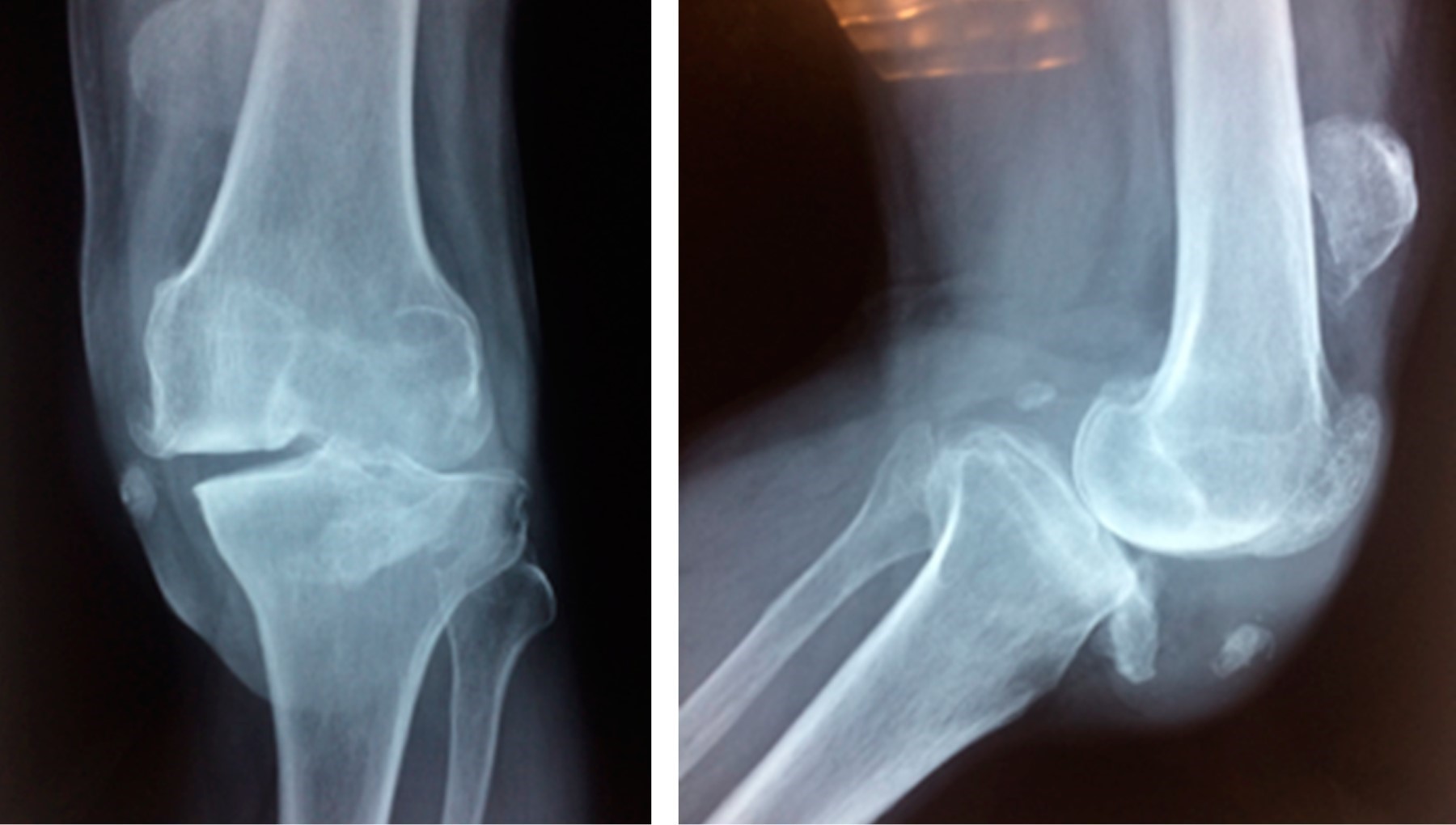 A la exploración física se observó marcha claudicante dependiente de bastón, genu varo de rodilla izquierda, más incapacidad para la extensión activa de la rodilla, con una contractura en flexión de 10o. A la palpación, la rótula se encuentra en tercio medio del muslo, móvil. En rodilla, se palpó subcutáneamente la superficie anterior de los cóndilos femorales y la tróclea, acompañado de dolor. También fragmentos óseos libres acompañados de crepitación y movilidad de los mismos.
