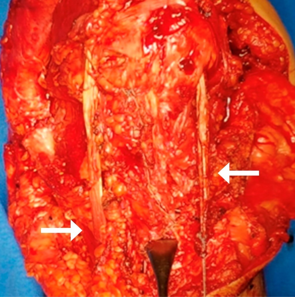 De la misma manera en lesiones crónicas existen técnicas quirúrgicas que garantizan la reactivación del aparato extensor, desde autoinjertos hasta injertos sintéticos. Kelikian y colegas,12 y Ecker y colaboradores13 fueron los primeros en reportar una reconstrucción de una lesión crónica con tendón de gracilis y semitendinoso, las dos con sus modificaciones en la perforación de los túneles tibiales y rotulianos; sin embargo, a través del tiempo se han agregado nuevas técnicas y modificaciones de las ya descritas1,2,3 como lo hicieron Larson y Simonian.9 Aunque Chen B8 realizó una modificación de cómo preservar la inserción de la pata de ganso ya que tiene muchas ventajas, son ricas en fibras tendinosas en su inserción, al preservar la inserción, la integración es más fuerte y se preserva la irrigación sanguínea. En esta técnica usamos el mismo método pero con túnel tibial de 4 mm a través de la rótula, ya que pasarlo por arriba de la rótula sería mucha tensión para los tendones con probable dificultad al bajarlo y colocar las dos anclas.7 A diferencia de otros autores, no usamos protección con cerclaje de Müller dada la posibilidad de ruptura, y nos iba a dificultar el segundo tiempo quirúrgico debilitando el trayecto del tendón a través de la rótula.