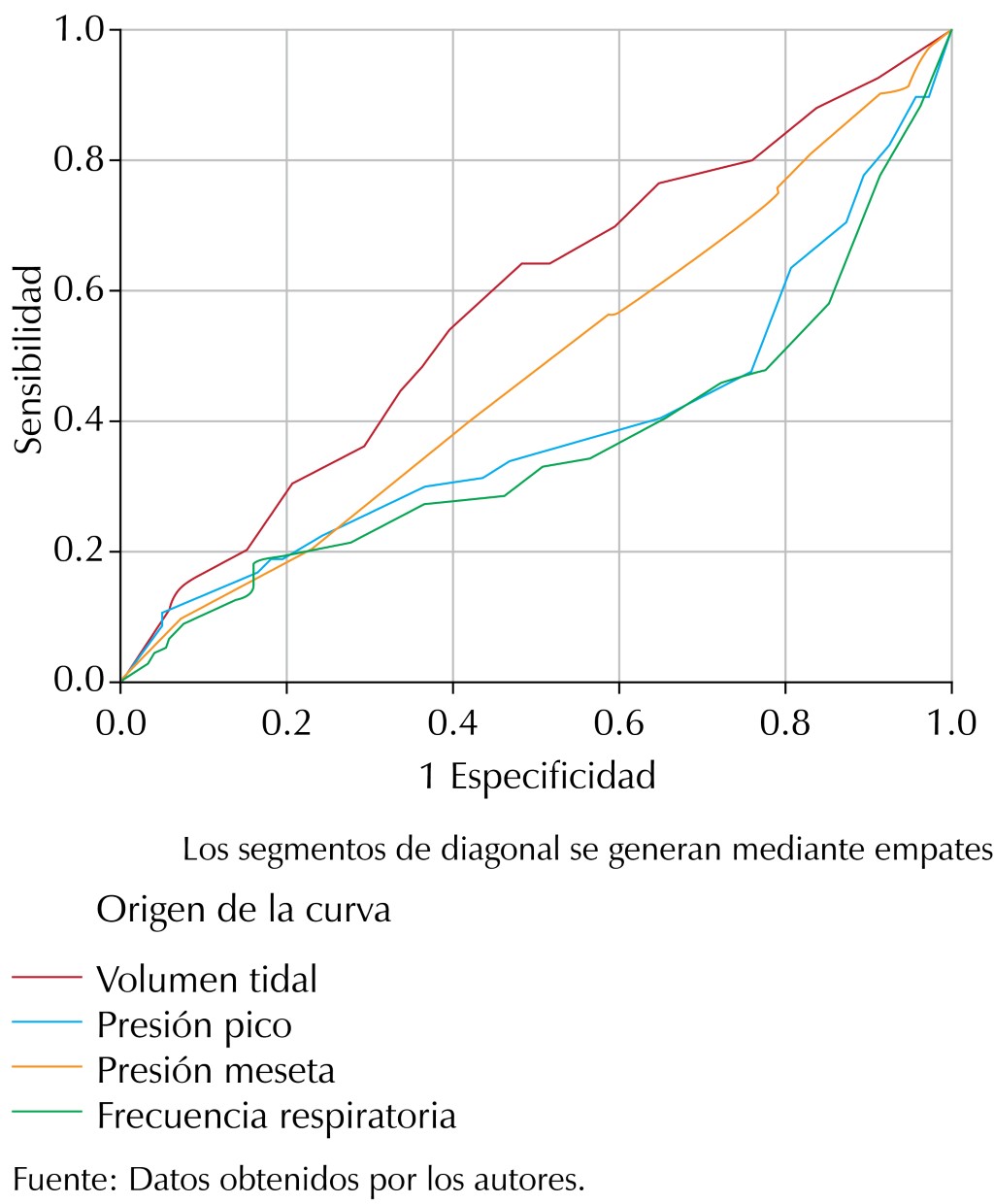 Dado que la fórmula de poder mecánico está compuesta por varios parámetros, se buscó determinar el que predijera mortalidad con mejor sensibilidad y especificidad, siendo la frecuencia respiratoria el parámetro con dichas características con una sensibilidad de 0.66 y una especificidad de 0.69 (IC 95% 0.51-0.69, p = 0.021) (Figura 1).