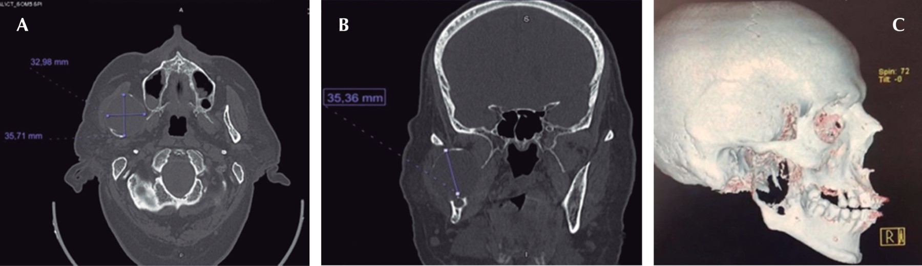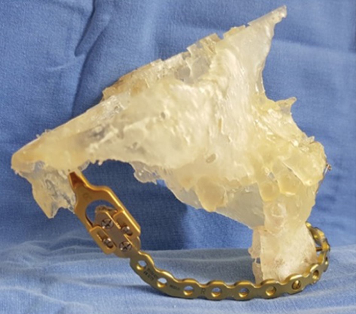 Inició padecimiento 19 meses previo a su primera valoración refiriendo chasquido súbito tras apertura máxima de la cavidad bucal, presentando dolor y aumento de volumen en la región posterior de la mandíbula derecha. En ortopantomografía se observa una zona radiolúcida, multilocular que abarca la rama ascendente derecha de la mandíbula y porción posterior del cuerpo mandibular con desplazamiento de tercer molar hacia borde cervical mandibular (Figura 1). En tomografía computarizada se observa lesión patológica multilocular que abarca la rama ascendente de la mandíbula, apófisis coronoides y hasta el cuello del cóndilo, la de mayor diámetro es de 35 × 32 mm con perforación de corticales casi en su totalidad y expansión de las corticales residuales (Figura 2). Se procede a realizar toma de biopsia incisional con un resultado de ameloblastoma folicular con datos de atipia celular (Figura 3), por lo que se decide solicitar gammagrama óseo que muestra una captación anormal en la rama mandibular derecha desde el cóndilo que correlacionan con la tumoración presente, así como un resultado negativo a la extensión metastásica ósea (Figura 4). Se decide realizar hemimandibulectomía y colocación de placa de reconstrucción con componente condilar. Se solicita estereolitografía para la preconformación de la placa de titanio y así disminuir el tiempo transoperatorio y márgenes de error en su colocación (Figura 5). Bajo anestesia general balanceada (AGB) se realizó fijación intermaxilar con ayuda de tornillos y cadena elástica. Se hizo incisión submandibular, se diseco el tejido por planos hasta llegar al hueso mandibular, se procedió a realizar hemimandibulectomía derecha, posteriormente se colocó placa de reconstrucción (Medartis MODUS®) con bloqueo y dispositivo condilar para reconstruir el cuerpo y rama mandibular (Figura 6), se verificó la oclusión, y el ajuste de la placa mediante toma de radiografía de control transoperatoria (Figura 7), se suturó por planos con sutura Vycril 3.0 y Polipropileno 5-0 para confrontar tejidos. El postoperatorio cursa sin complicaciones, por lo que se decide su egreso hospitalario para continuar su tratamiento por consulta externa en servicio de cirugía maxilofacial (Figura 8). El resultado histopatológico de la muestra completa reporta un espécimen formado por islas y cordones de epitelio ameloblástico de aspecto folicular y acantomatoso y displasia leve en un tejido conectivo fibroso denso bien vascularizado. Dos años después del procedimiento quirúrgico el paciente se encuentra asintomático y sin datos clínicos o radiográficos de recidiva.