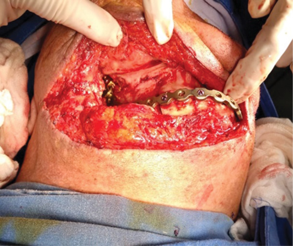 El tratamiento de elección del ameloblastoma es quirúrgico, ya que se debe minimizar la probabilidad de recidiva afectando lo menos posible la función y estética del paciente. Referente al tratamiento conservador, se utilizarán técnicas de marsupialización o enucleación, combinadas o no con técnicas de soporte como el curetaje, el uso de solución de Carnoy o el nitrógeno líquido.16,17 En caso de un tratamiento radical se optará por la realización de hemimandibulectomía o resecciones en bloque del área afectada con necesidad de márgenes de seguridad de 1-1.5 cm, ya que las células del ameloblastoma llegan a encontrarse a 8 mm del margen radiográfico y clínico del tumor.18,19 Existe una variedad de opciones reconstructivas que van desde osteoinjertos autólogos libres o microvascularizados, distracción ósea, así como diversos sistemas de reemplazo protésico que en la actualidad presentan alternativas de tratamiento personalizadas a la condición patológica del paciente. Tradicionalmente la reconstrucción mandibular con placa de titanio es una opción aceptable que se utiliza de manera convencional.20