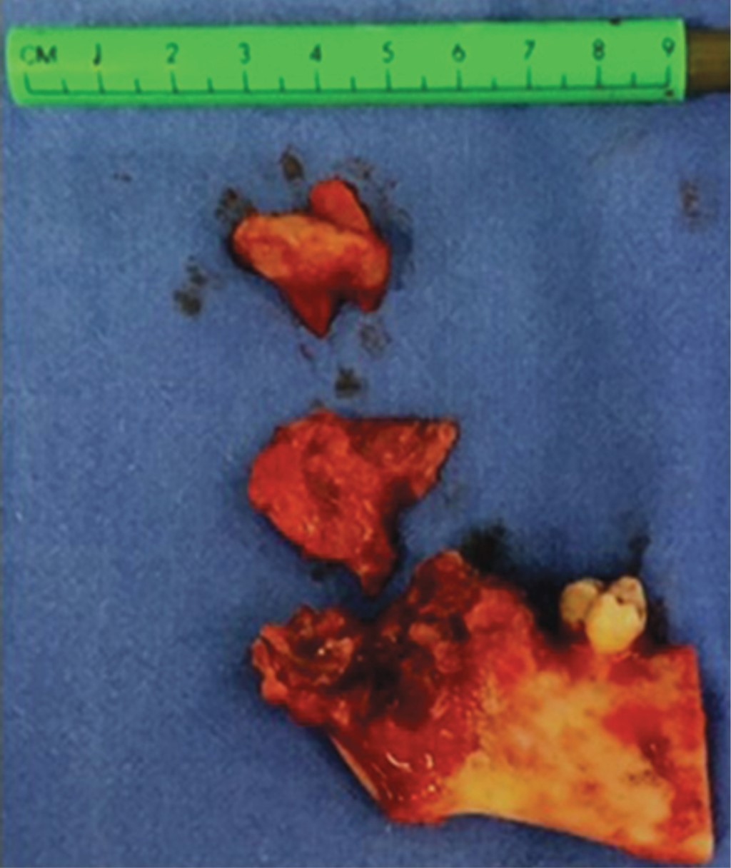 De acuerdo a las características clínicas e histopatológicas que se presentan en este caso, se decidió realizar un tratamiento radical (hemimandibulectomía) debido a la gran extensión de la lesión, esperando una adecuada respuesta al tratamiento y una buena evolución, sin el uso de la terapia coadyuvante que Kalaskar R y colaboradores22 recomiendan, el cual ha aumentado la eficacia de este tipo de tratamientos con el uso de crioterapia, electrocauterio y solución de Carnoy, aunque se ha comprobado que estas terapias coadyuvantes no son apropiadas donde el tejido blando y la cortical se encuentren adelgazados o existan perforaciones.21