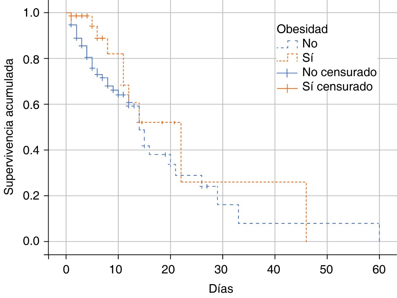 Los días de estancia hospitalaria y los días de ventilación mecánica fueron más en el grupo de pacientes con obesidad (Tabla 2).