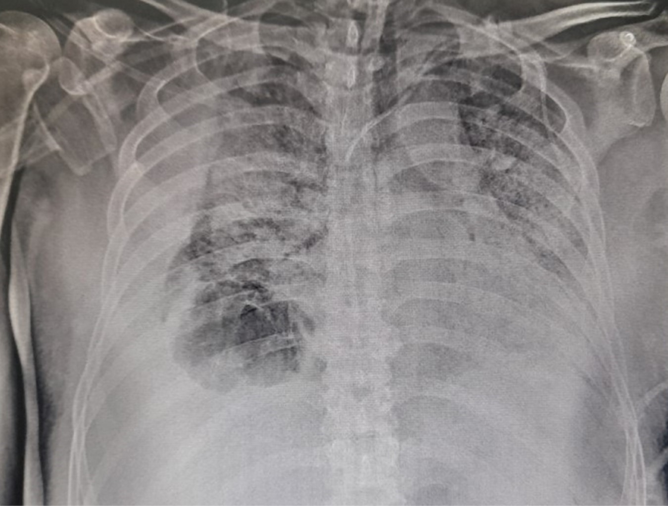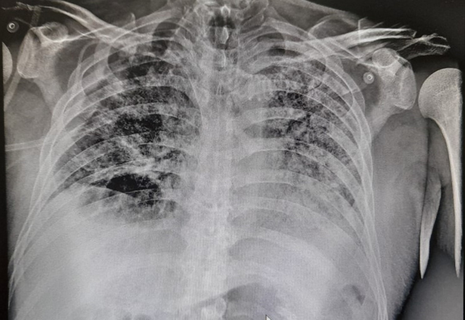 La enfermedad por SARS-CoV-2 (COVID-19) es una infección causada por un nuevo coronavirus emergente detectado por primera vez en Wuhan (China) en diciembre de 2019.1 Las manifestaciones radiológicas típicas de los pacientes con COVID-19 consisten en la presencia de opacidades pulmonares bilaterales (tanto imágenes en vidrio despulido como consolidaciones) observadas en las primeras etapas y puede ser atribuido al edema del espacio alveolar e inflamación causada por la infección.2 Los casos que responden mal al tratamiento progresan a lesiones múltiples y difusas.3
