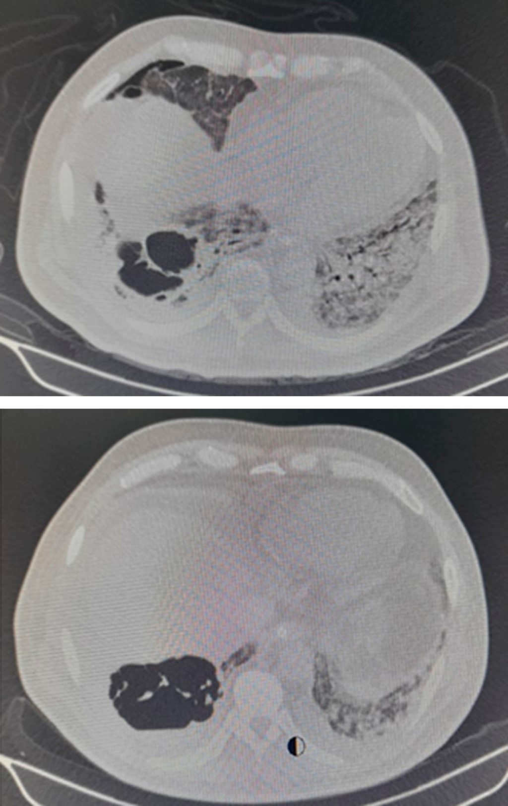 Se trata de un hombre de 56 años sin antecedentes de importancia, el cual presenta cuadro de fiebre, tos, rinorrea, malestar general. El día dos de iniciado el cuadro clínico se realiza reacción en cadena de la polimerasa (PCR) para el SARS-CoV-2 cuyo resultado fue positivo, recibe tratamiento domiciliario. El día tres de iniciado el cuadro es trasladado a un hospital privado por persistir con disnea y desaturación requiriendo administración de oxígeno suplementario. El día 10 de iniciado el cuadro muestra datos de dificultad respiratoria e hipoxemia ameritando intubación orotraqueal e inicio de ventilación mecánica por presentar síndrome de insuficiencia respiratorio agudo (SIRA) severo de acuerdo a la clasificación de Berlín (PaO2/FiO2 70 mmHg). Durante su estancia recibe tratamiento a base de levofloxacino, tocilizumab y dexametasona, por la mala evolución clínica requiere de parámetros altos de ventilación y apoyo con vasopresor. Se decide traslado a nuestro hospital 28 días después de haber iniciado el cuadro clínico. Es ingresado a terapia intensiva donde se le realizó traqueostomía percutánea por ventilación prolongada, permanece con requerimientos altos de fracción inspirada de oxígeno. El día 40 de iniciado el cuadro se documenta en radiografía de tórax imagen radiolúcida en tercio inferior derecho compatible con bulla pulmonar (Figura 1). Se realiza tomografía computarizada de tórax, la cual reporta área de atrapamiento aéreo con presencia de septos en su interior en segmento 10 del pulmón derecho (S10) compatible con bulla y neumotórax (Figura 2).