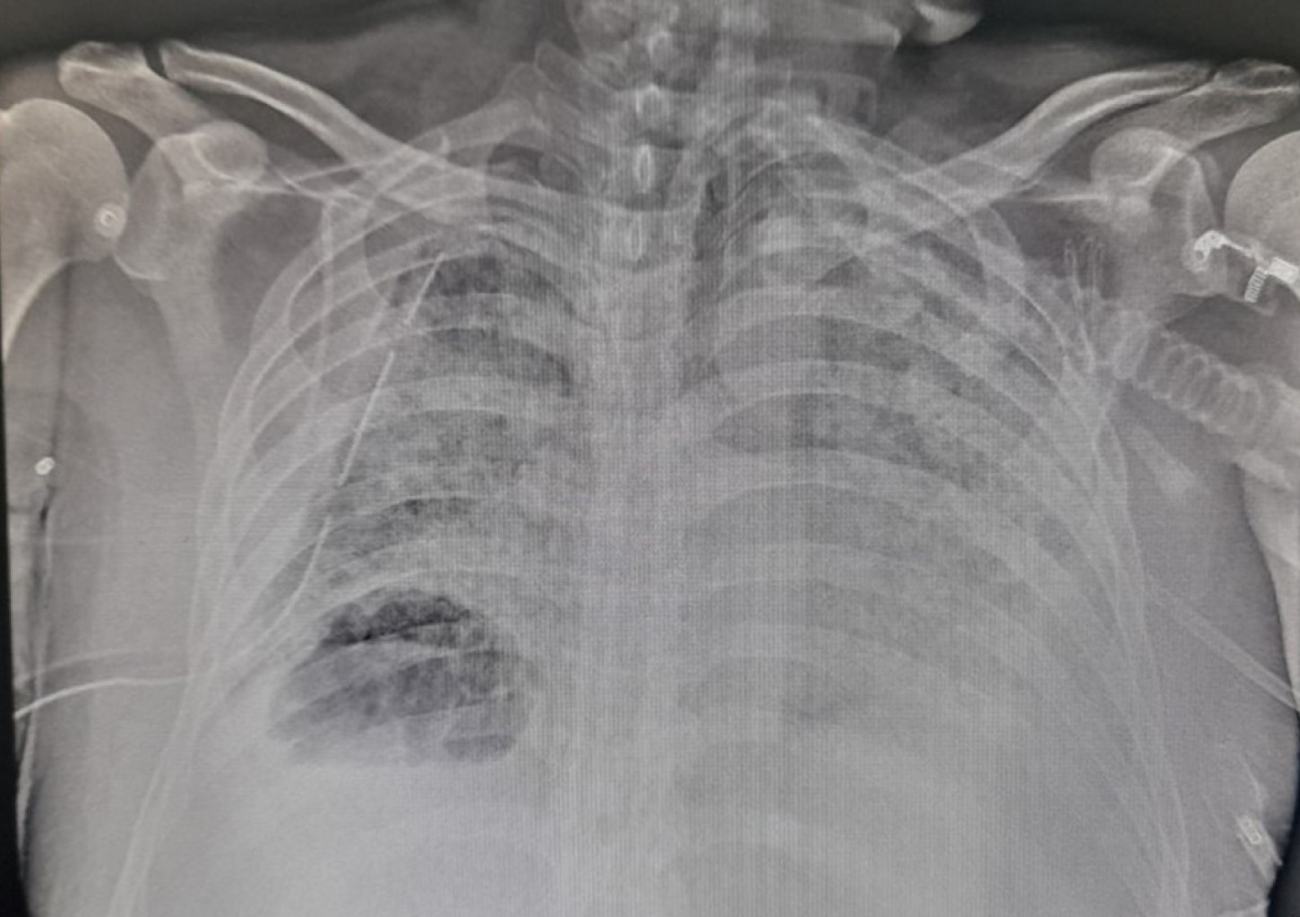 Se decide colocar sonda endopleural en quinto espacio intercostal en su intersección con la línea axilar media derecha obteniendo 200 mL de material serohemático, se conecta a succión continua, se verifica colocación de sonda endopleural con control radiográfico posterior (Figura 3). Se solicita valoración por el servicio cirugía de tórax, quien indica manejo conservador con seguimiento a través de estudios de imagen. Se retira la sonda endopleural a los 10 días de colocada, corroborando expansión pulmonar (Figura 4). Se logra el retiro de la ventilación a los 68 días de iniciado el cuadro y 58 días de ventilación mecánica tolerando de manera adecuada, siendo egresado a sala general para continuar con su manejo.