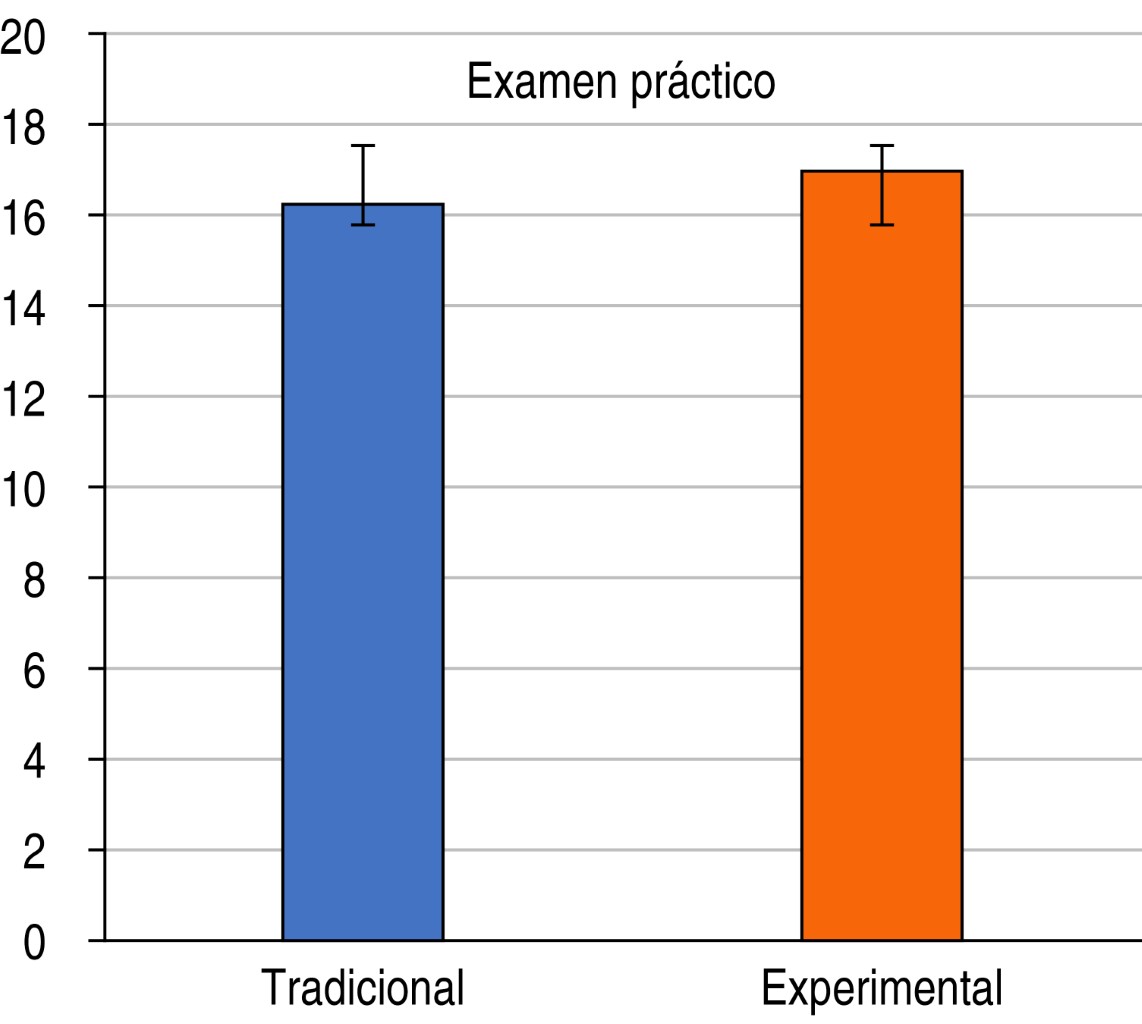 En cuanto a la evaluación práctica, la puntuación media del grupo tradicional fue de 16.4 ± 1.2 puntos, mientras que del grupo experimental fue de 17 ± 1.86 puntos (p > 0.05) (Figura 3).
