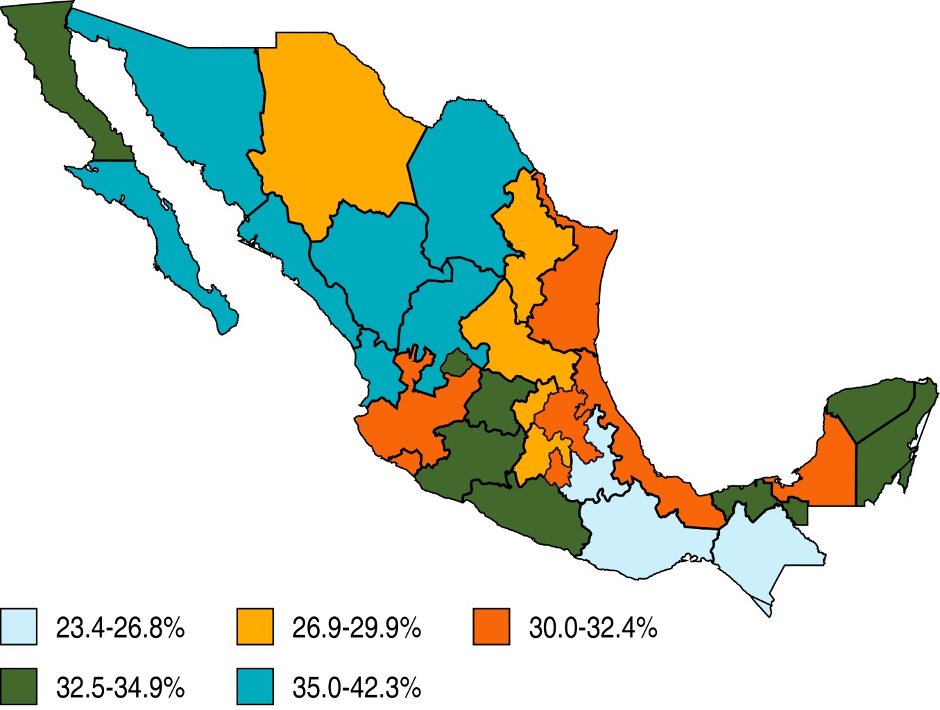 According with the best designed and executed ENSANUTs, some non-governmental, academic studies, with huge but non-probabilistic samples have shown that the prevalence of HBP in adult Mexicans goes from 25 to 35%, which has not changed in the last 20 years.6,26,27 As other cardiovascular risk factors, HBP has a mosaic-type geographical distribution along our territory, with a northern-southern gradient, according to which, some northern federative states have the highest prevalence rates of HBP, in contrast with some of the southernmost states that show the lowest values. These differences probably signal the effect on BP of the westernized lifestyle adopted by the urbanized acculturated population living in the more developed and industrialized federative states (Figure 1).15